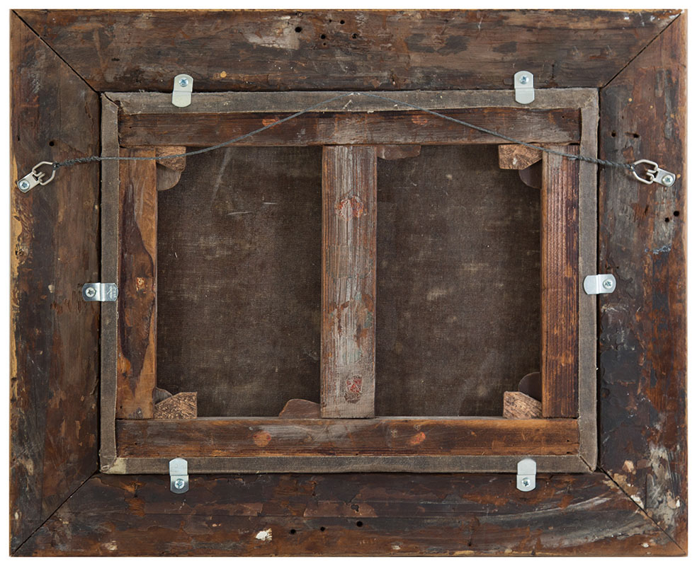 CONDITION: Scattered craquelure, several scattered touches of inpaint, older reline, frame shows wear, sold as is.