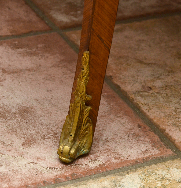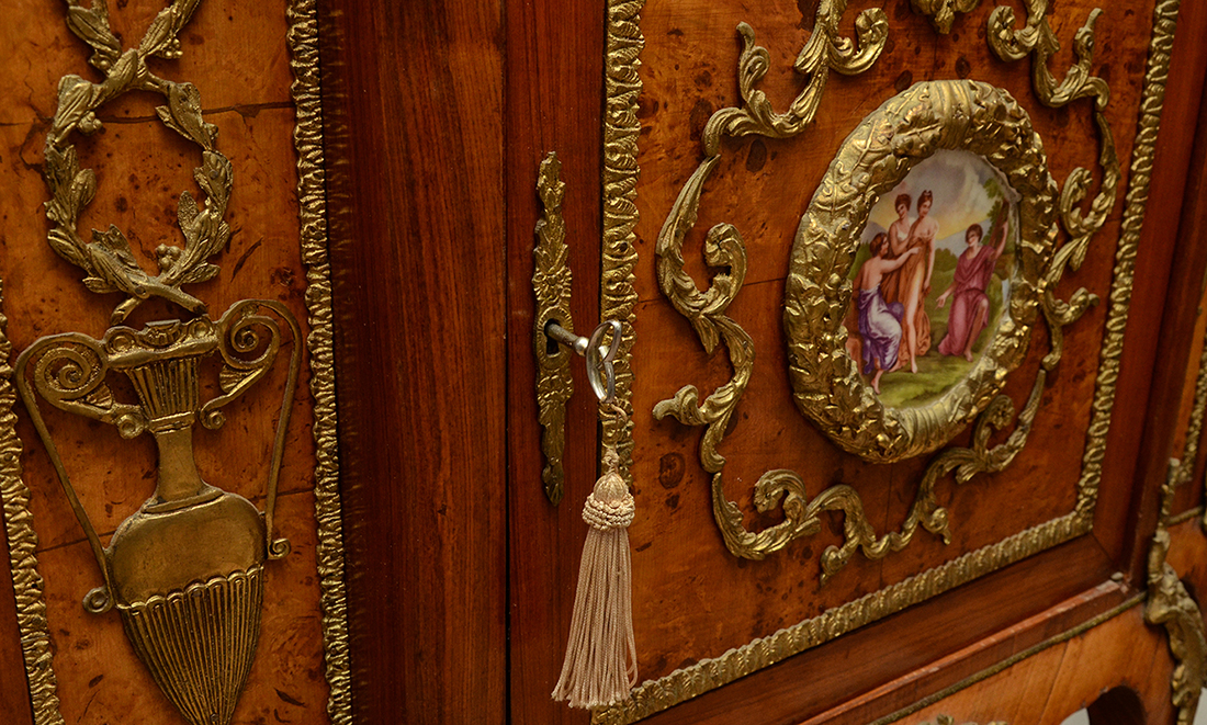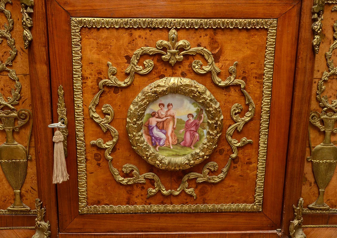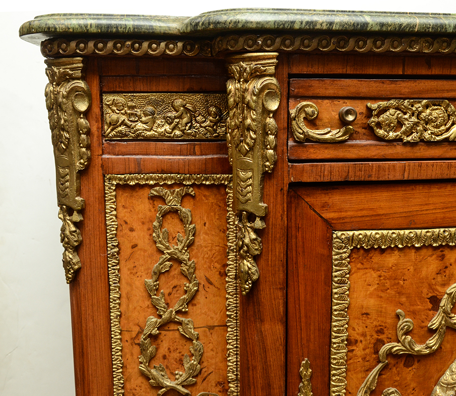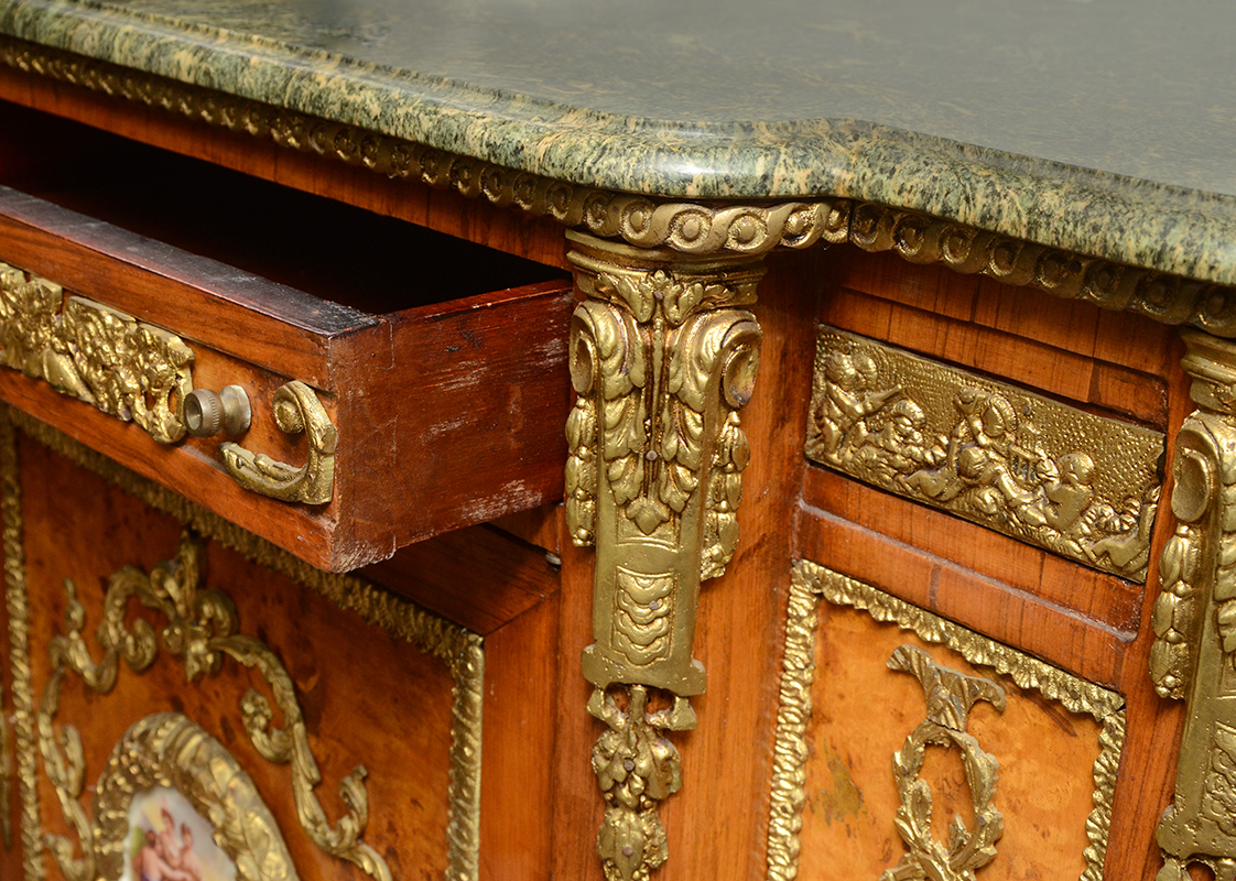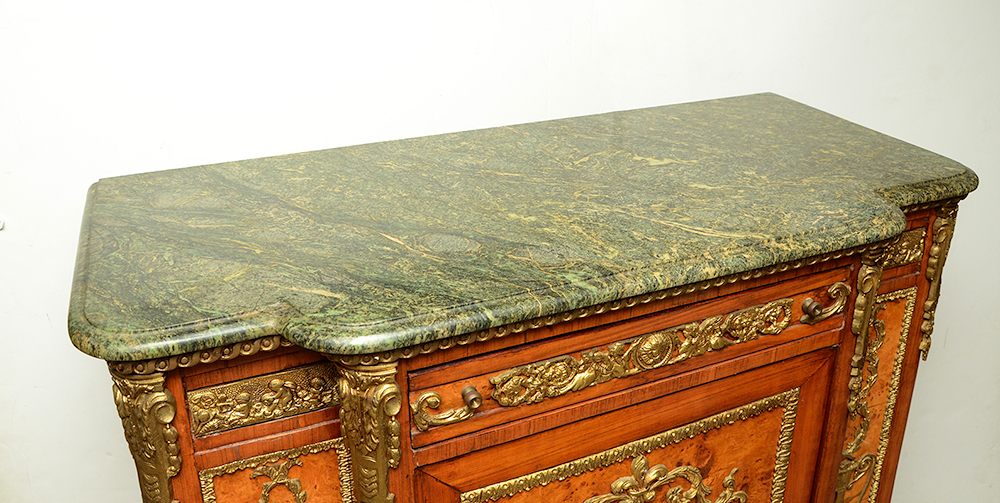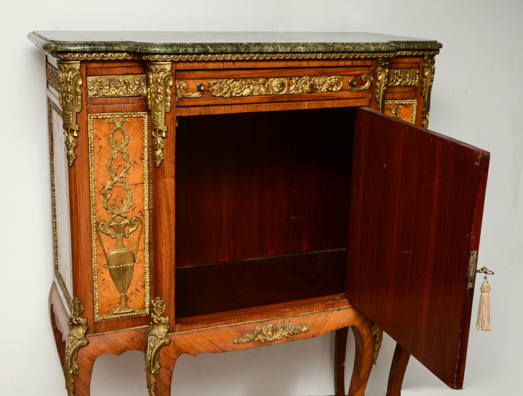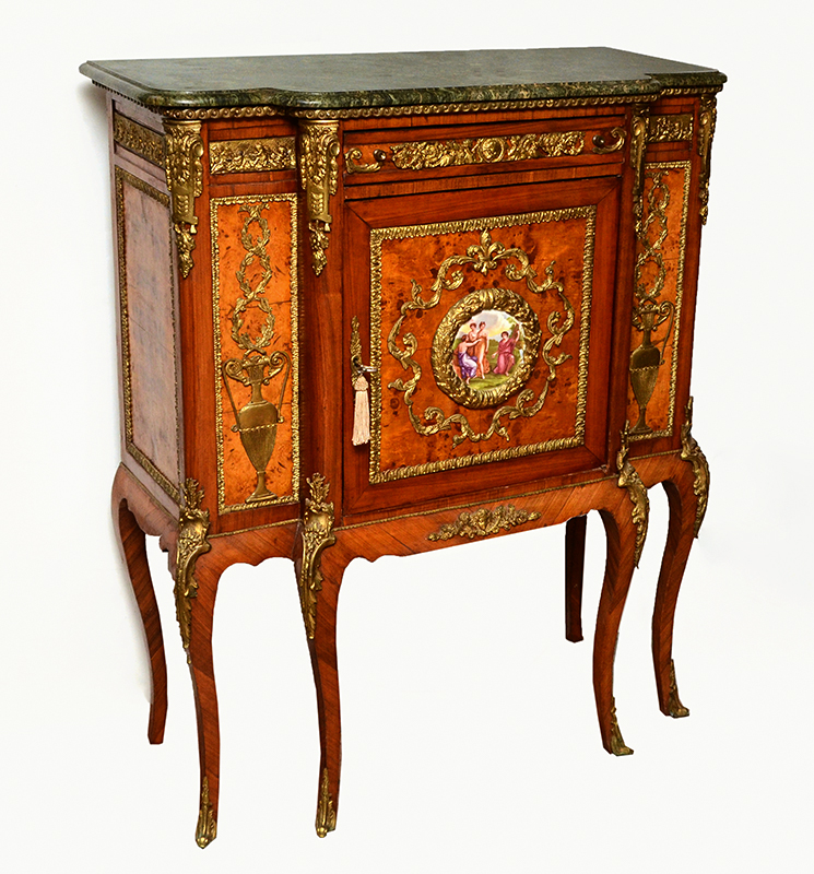 FRENCH LOUIS XV STYLE SIDE CABINET: Green variegated shaped marble top, single drawer over single door with porcelain transferware center medallion, open interior. Shaped apron & legs, applied gold decorated cast metal decoration and mounts all over, burl veneer accents. Overall measures 50'' h. x 41'' x 19''.