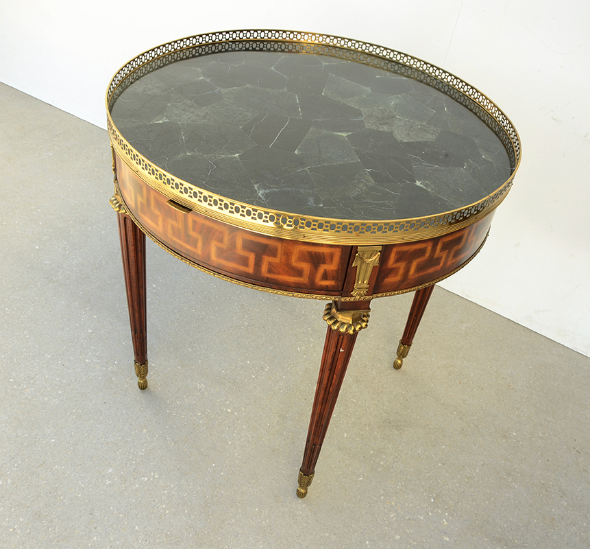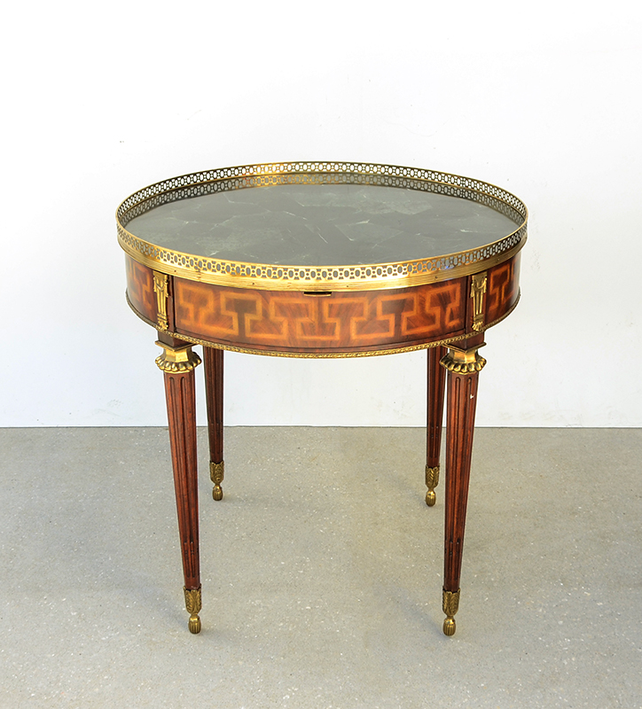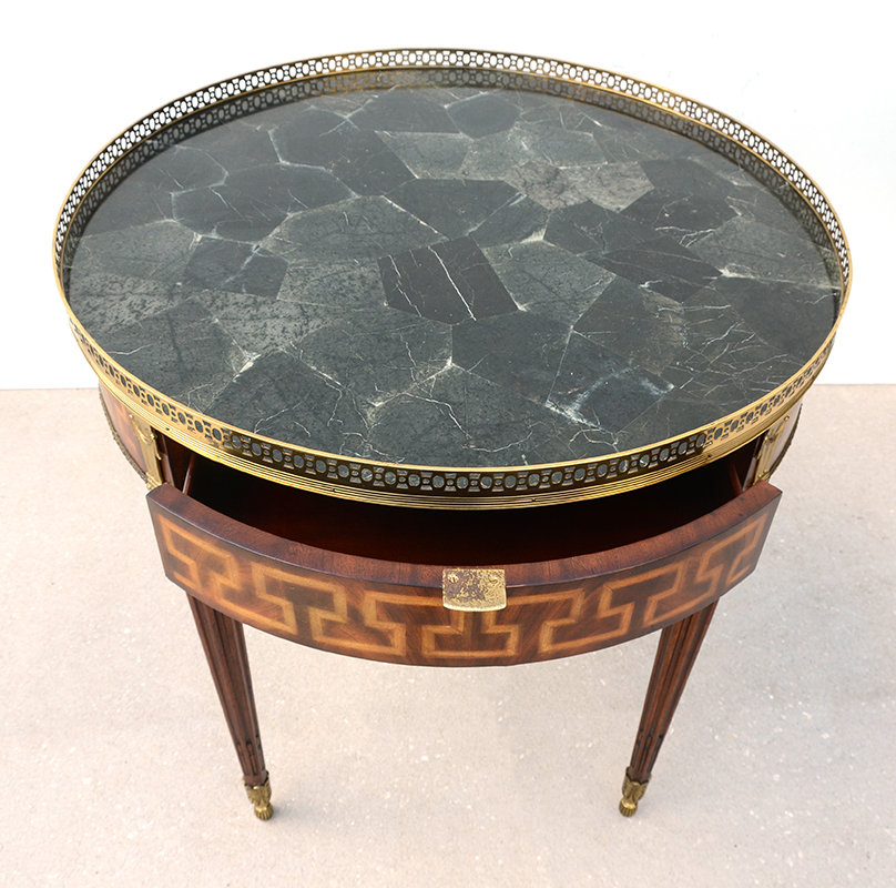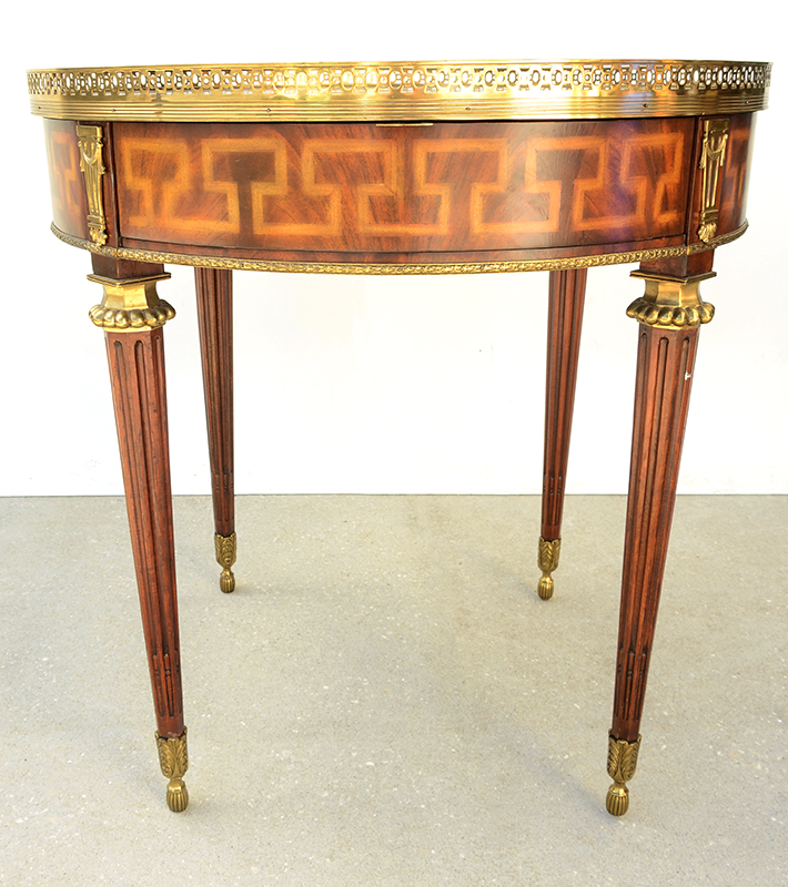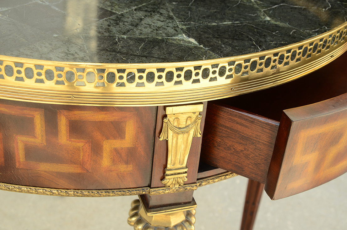 MAITLAND SMITH INLAID SIDE TABLE: Round top with pierced brass gallery, marble appearance clad top. Apron with Greek key motif inlay and two drawers with Maitland Smith tag inside. Fluted tapered legs with gilt metal mounts, overall 32 1/4'' h. x 31 1/2''.