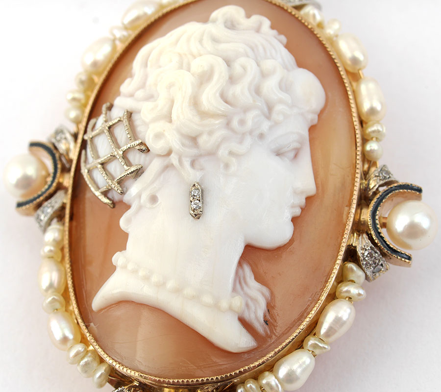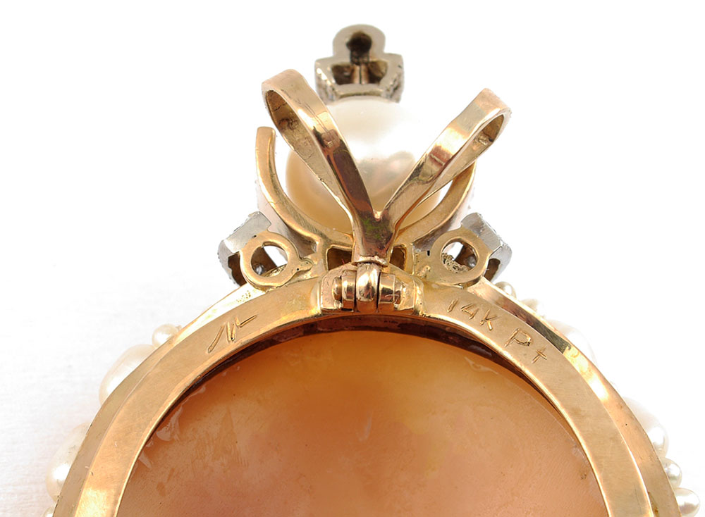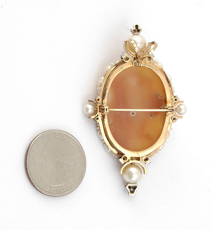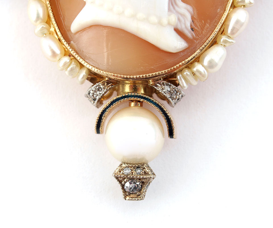 DIAMOND AND PEARL CAMEO PENDANT: 2.5'' h x 1.5'' w. the beautifully detailed profile is surrounded by pearls and diamonds, all of which are set in 14K gold. Stamped with the maker's mark and 14K P+. Can be worn as a brooch or pendant.