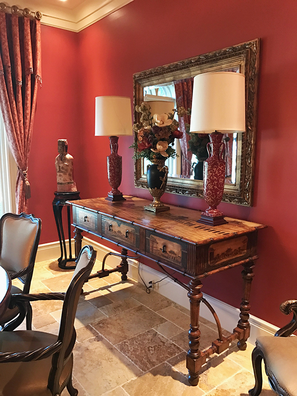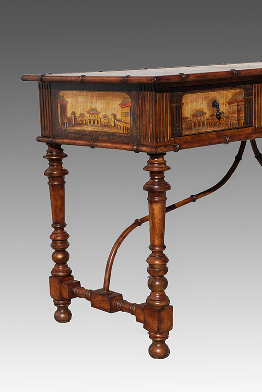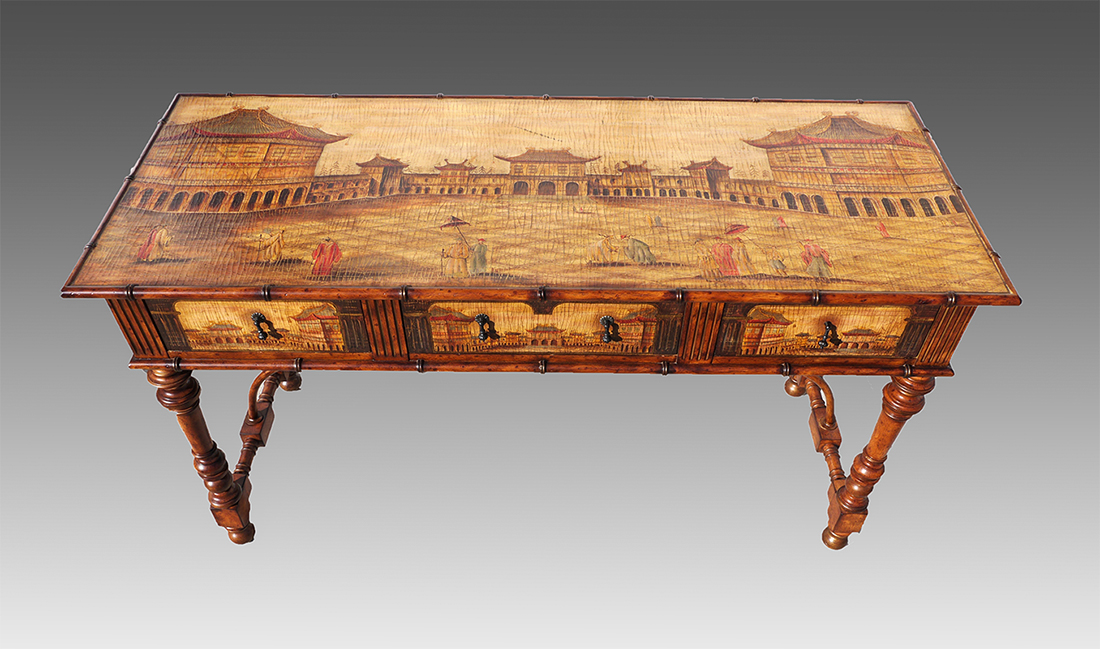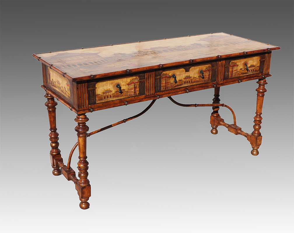 ORIENTAL MOTIF DECORATED SIDEBOARD: Chinese courtyard scene decorated top, sides and drawer fronts with crack finish, faux bamboo trim, 3 drawers. Turned legs and stretcher, metal faux bamboo supports. Overall measures 41 3/4'' h. x 74'' x 30 1/4''.