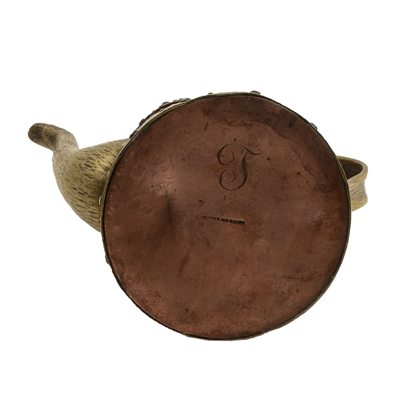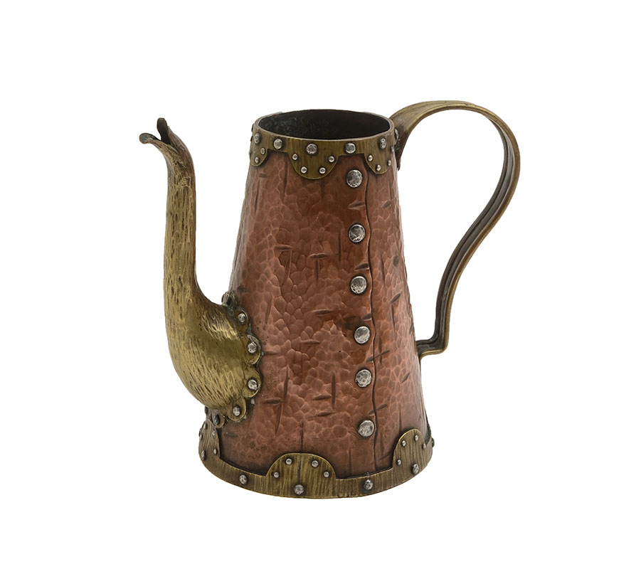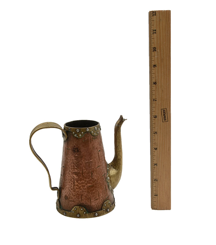 JOSEPH HEINRICHS MIXED METAL CHOCOLATE POT: Copper, brass and silver chocolate pot, no lid, stamped Copper and Silver on base. Identical marked pot sold at Treadway Gallery, August, 2015. Measures 5 3/4'' h. x 6''.