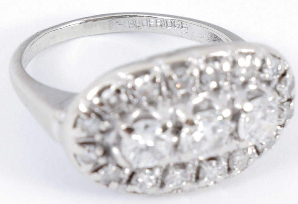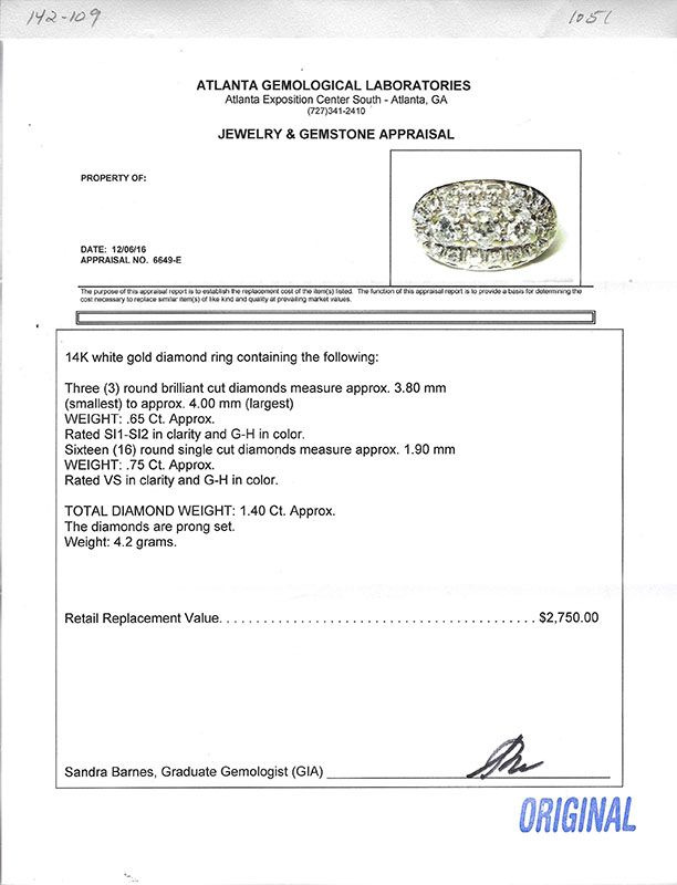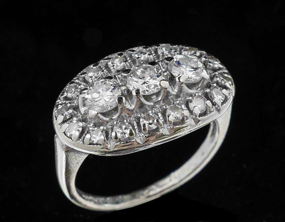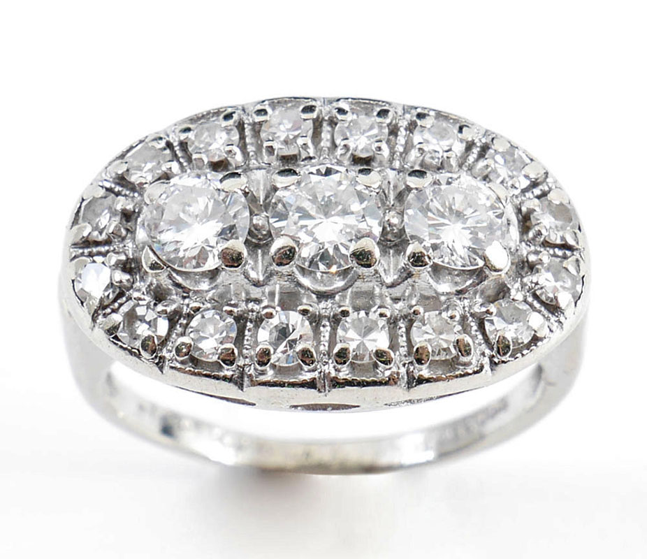 14K WHITE GOLD MID-CENTURY 3-STONE RIGHT HAND RING: 3 round brilliant cut diamonds are .65 CT approx rated SI1-SI2 in clarity and G-H in color. 16 round single cut diamonds are .75 CT approx, rated VS in clarity and G-H in color. Size 5.5. Total weight 4.2 grams. Sold with current Atlanta Gemological GIA graduate's appraisal for $2750.
