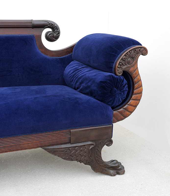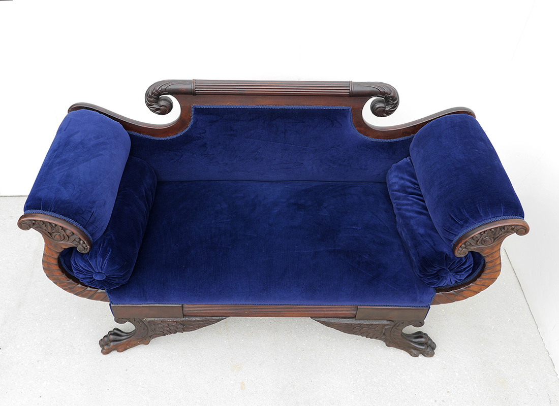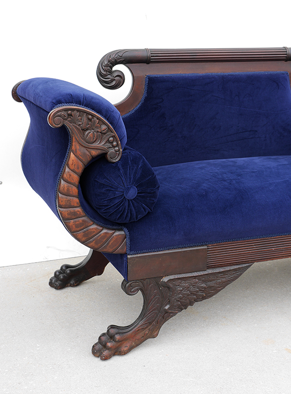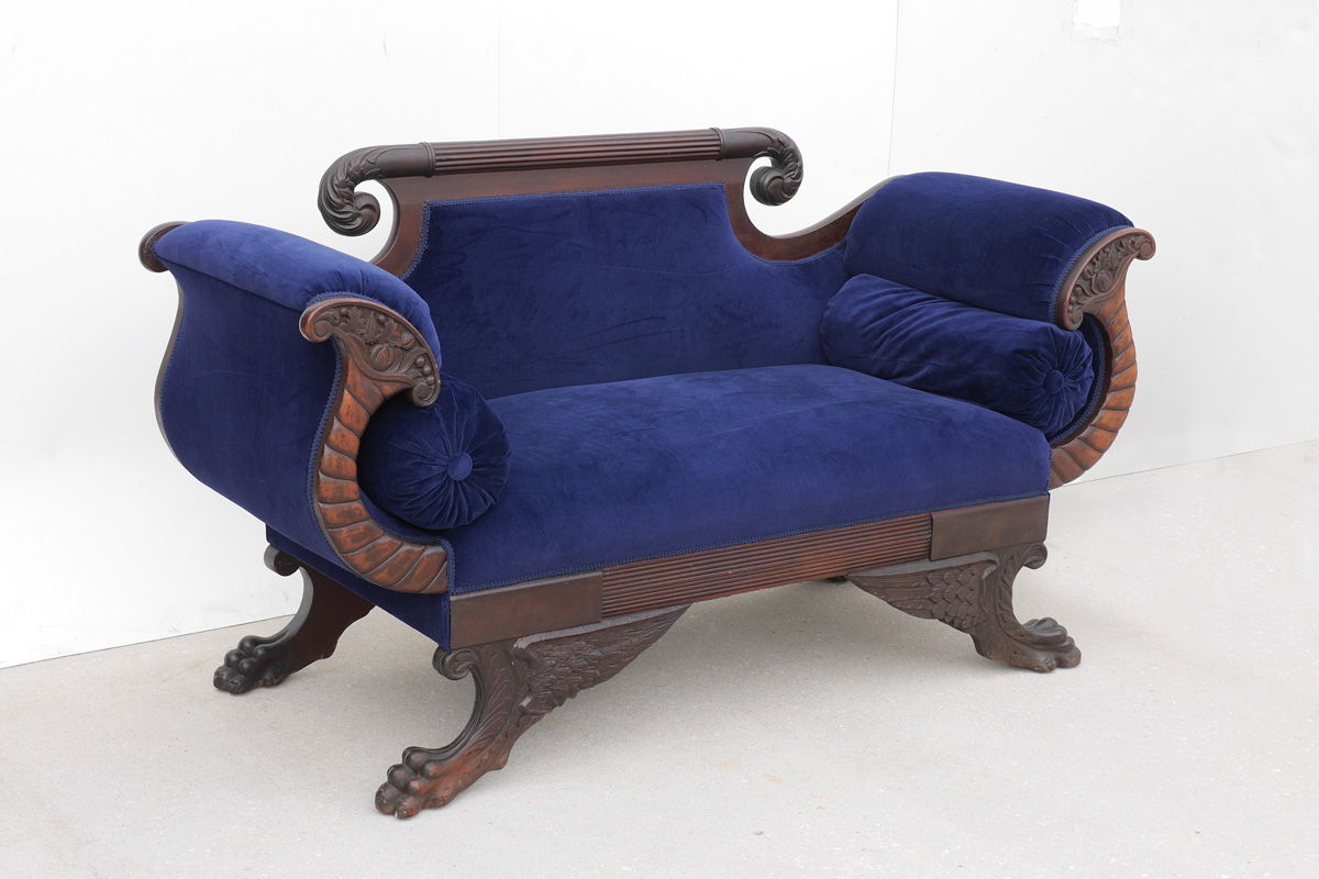 EMPIRE CARVED SOFA: Fluted top rail with carved foliate scroll ends, shaped arms with carved floral basket motif front, fluted skirt, winged paw feet. Navy blue upholstery, overall 35 1/4'' h. x 63 1/4'' x 24 1/2''.