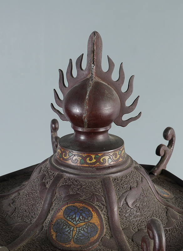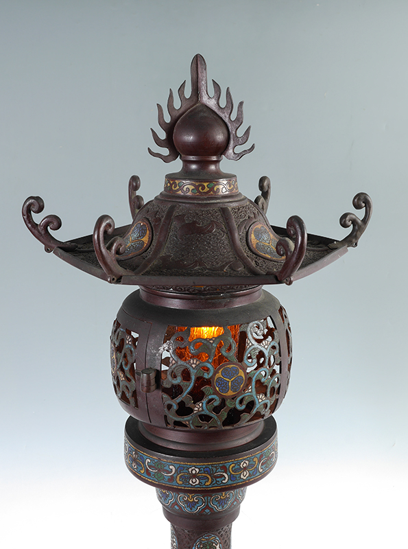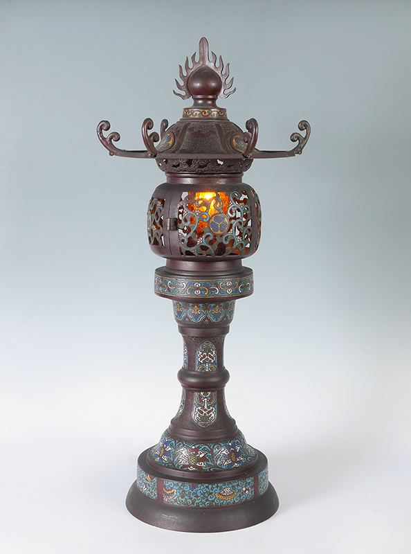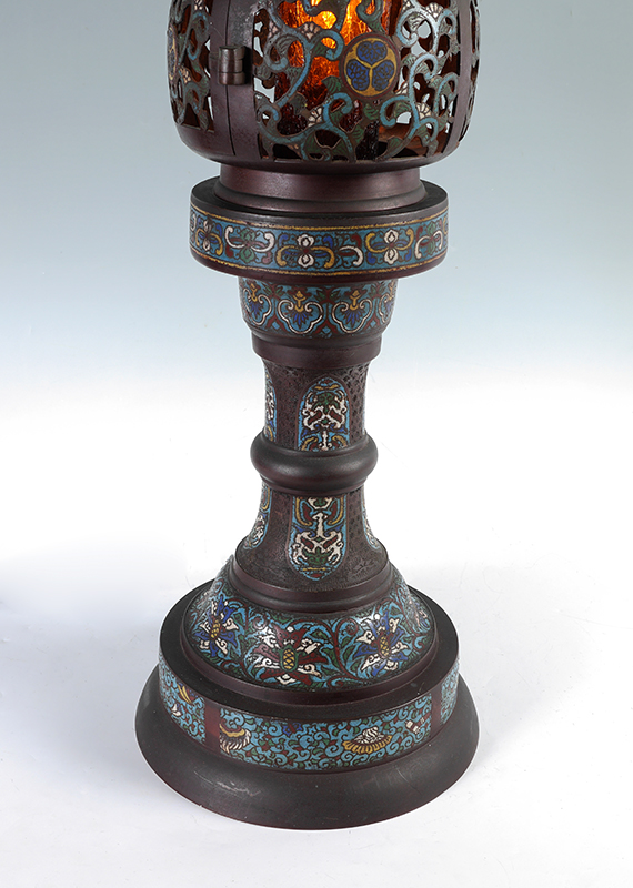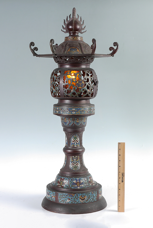 CHAMPLEVE CHINESE GARDEN LANTERN: Pagoda form top with flaming orb finial, reticulated body, floral motif tiered champleve base, overall measures 35 1/2'' h. x 15 3/4'' dia.