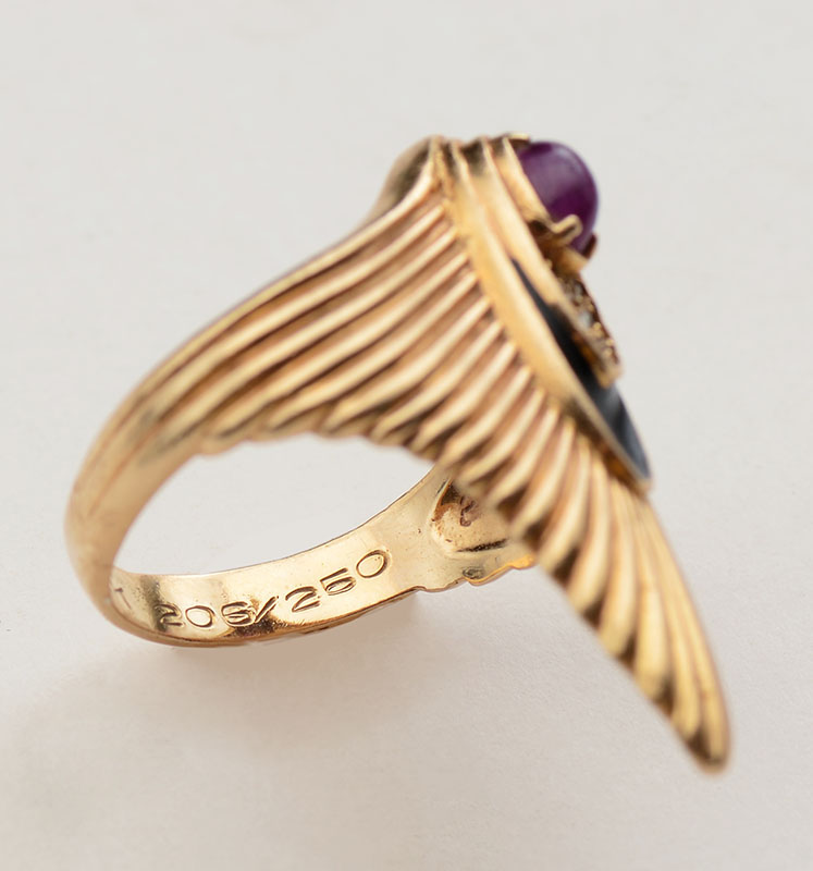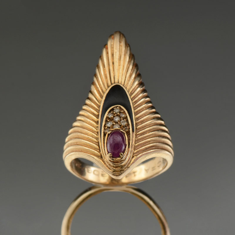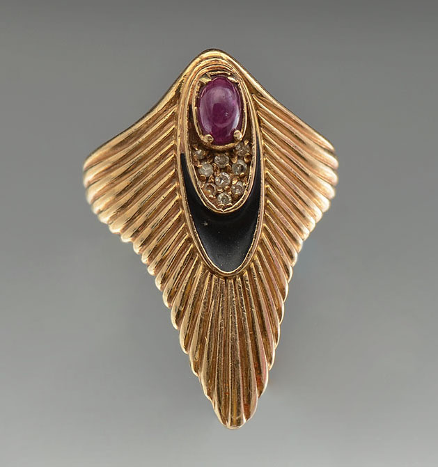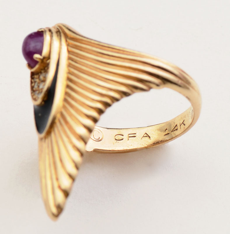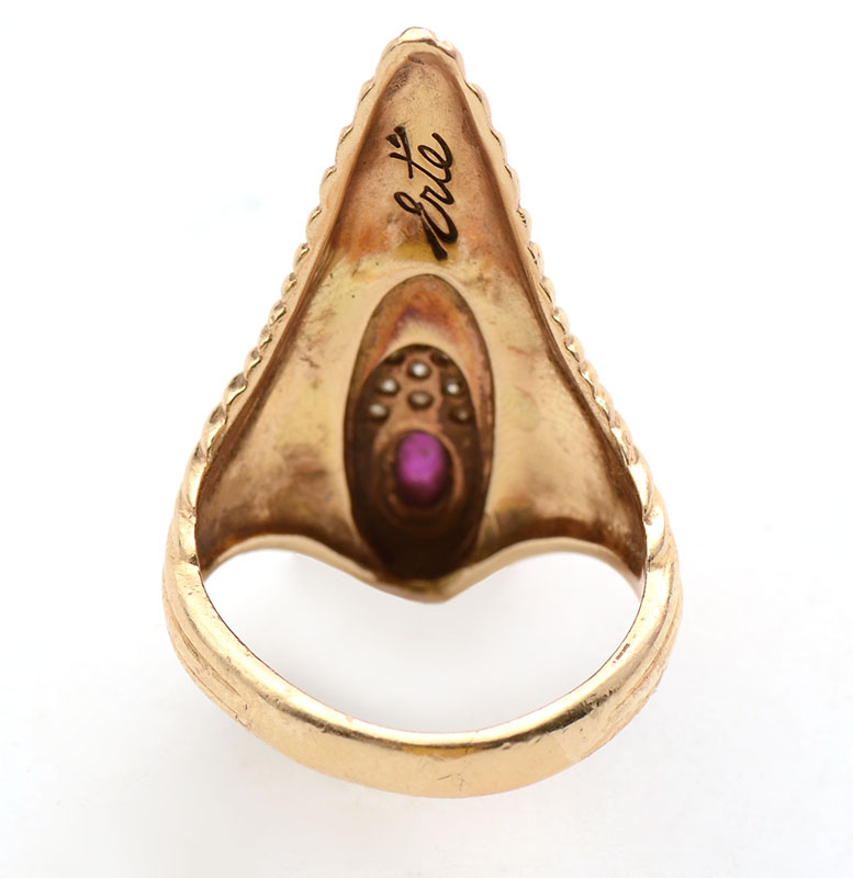 14K RUBY & DIAMOND ERTE RING: Stamped 206/250 and marked ERTE, 14K yellow gold ring contains one oval cabochon cut ruby. Weight: .40 Ct. Approx. SI in clarity, stpR in Hue, 5-6 in Tone and 2-3 in Saturation. 9 round single cut diamonds. Weight: .07 Ct. Approx. Rated VS in clarity and H-I in color. The ruby and diamonds are prong set. Black enamel decoration. Weight: 6.3 grams. Size: 5.5