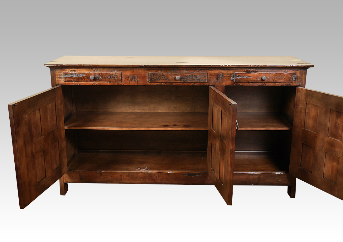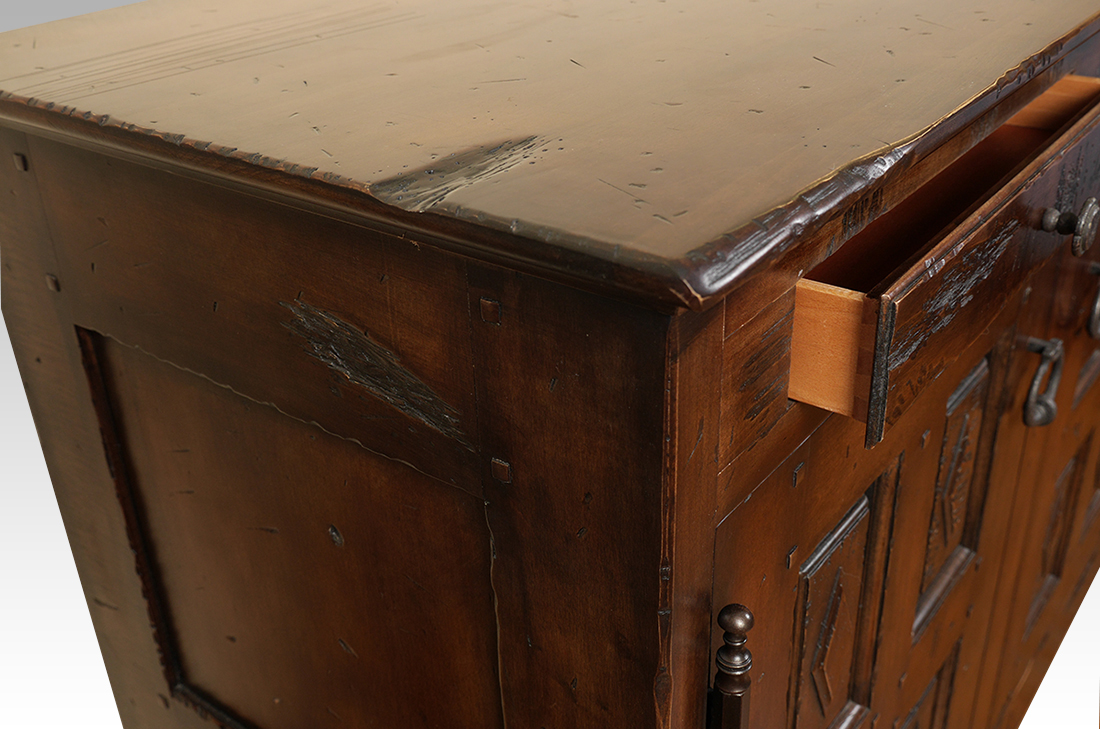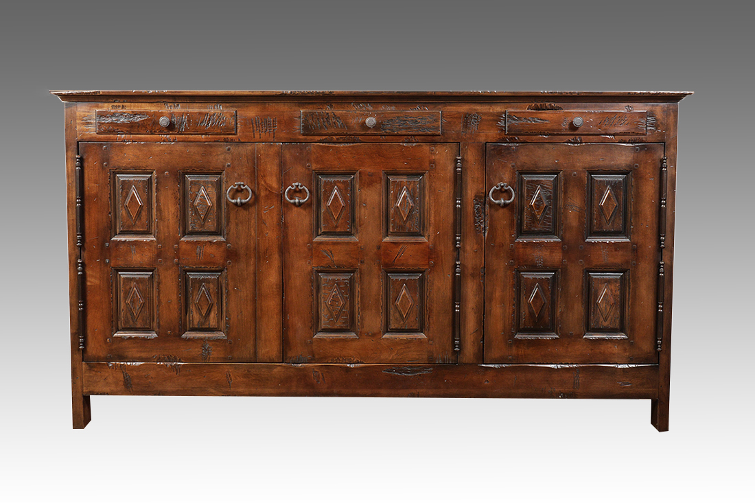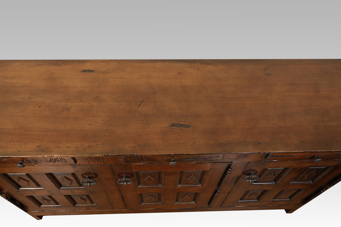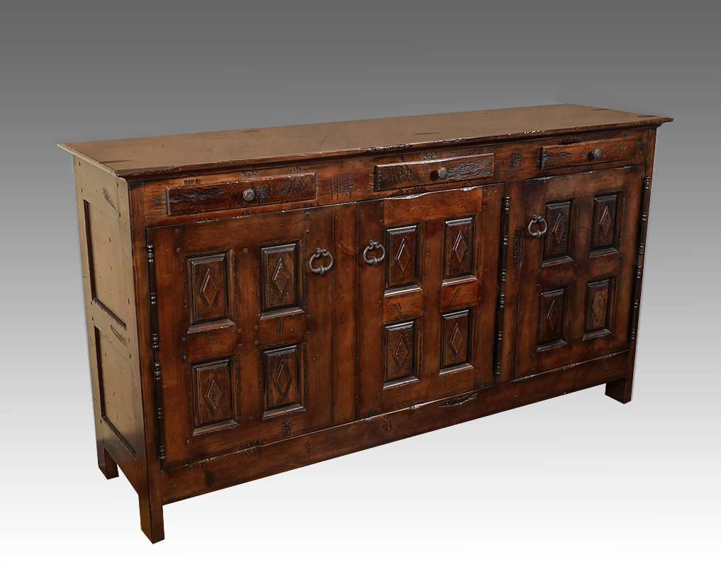 RALPH LAUREN SPANISH REVIVAL SIDEBOARD: Antiqued Spanish revival style sideboard/credenza with intentional distressed appearance, 3 drawers over 3 doors, Ralph Lauren metal tag inside drawer. Overall measures 44 1/2'' h. x 81 1/4'' x 23''.