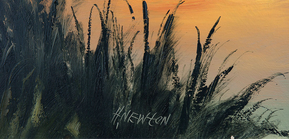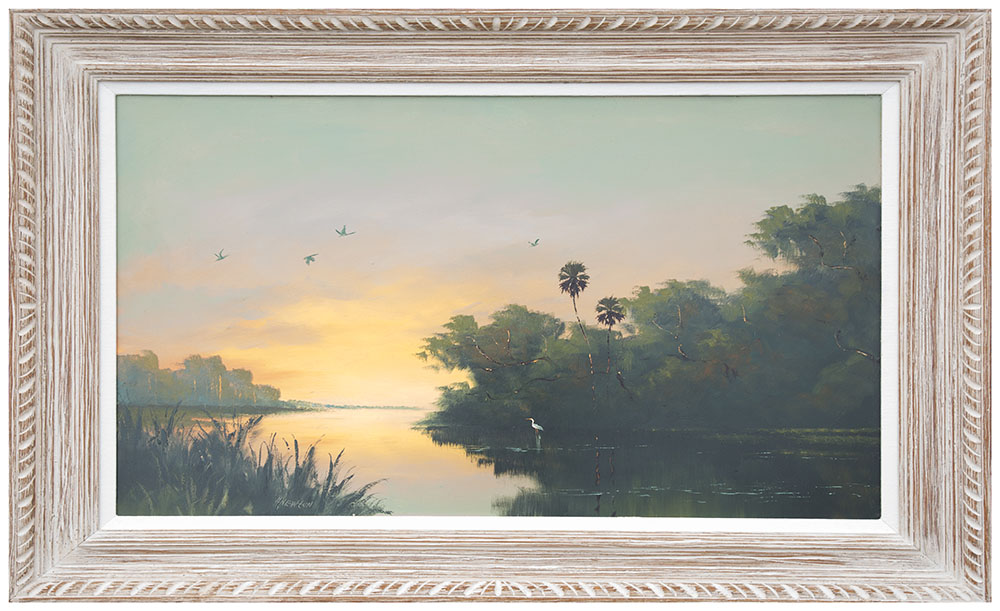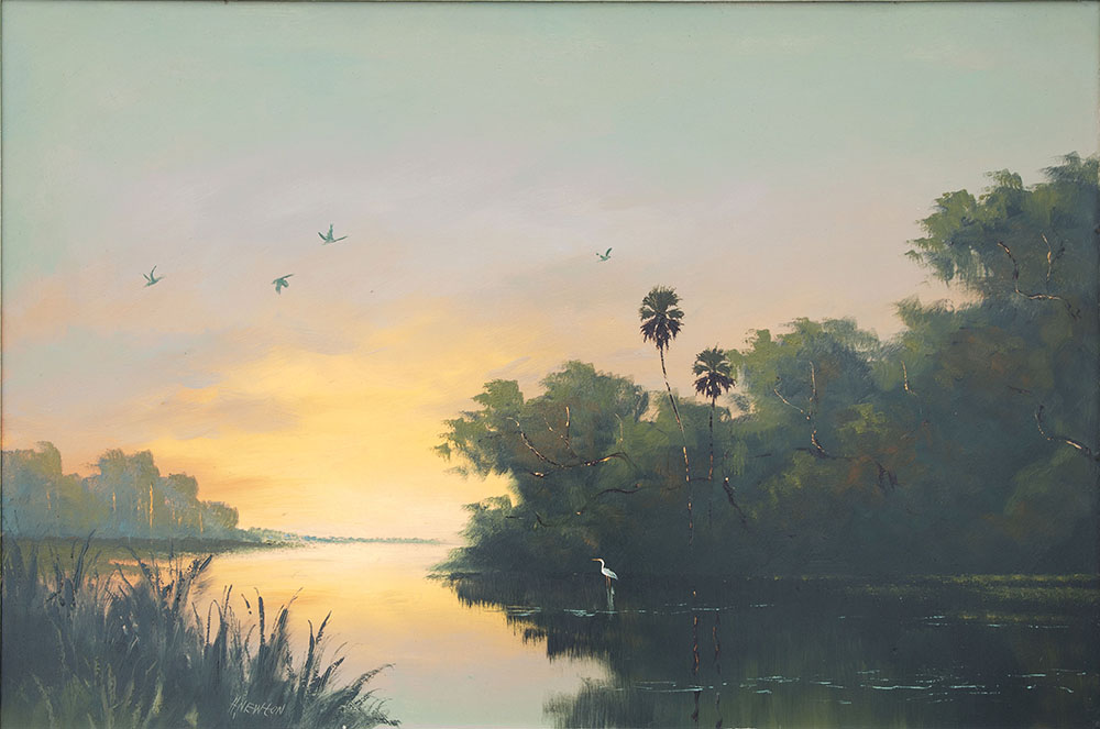 NEWTON, Harold, (American, 1934-1994): Florida Highwaymen serene sunrise backwater river scene with birds, Oil/Masonite, signed lower right, 24'' x 36'', framed 33'' x 45''.