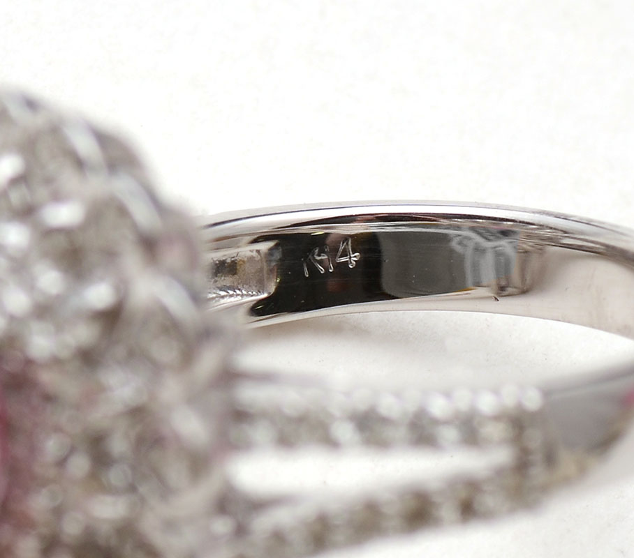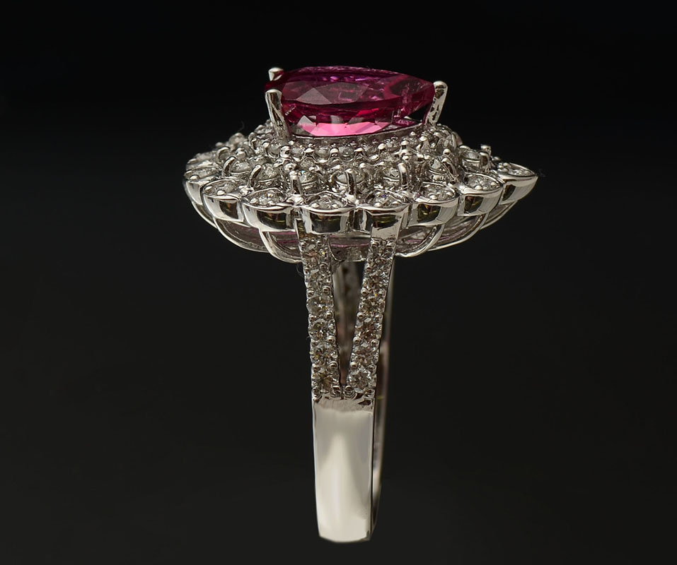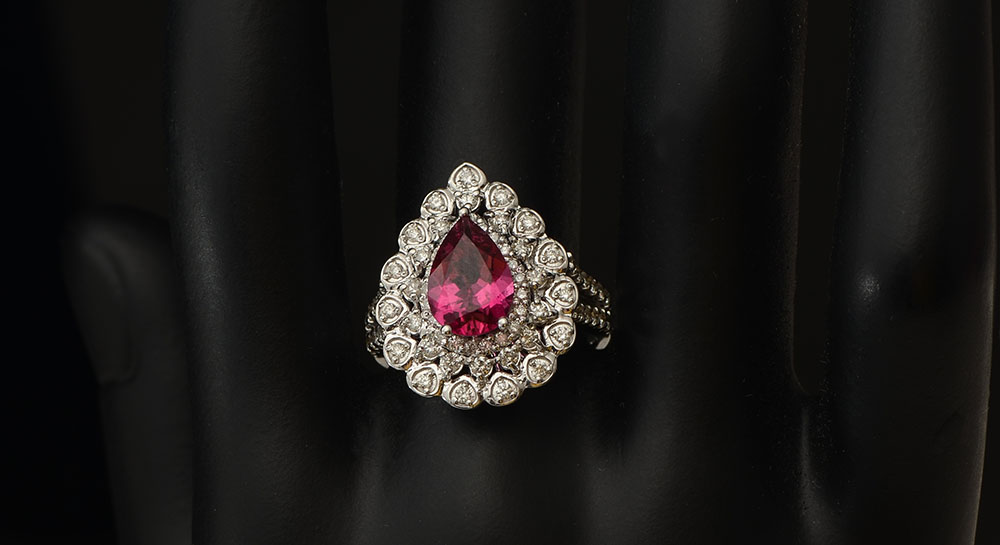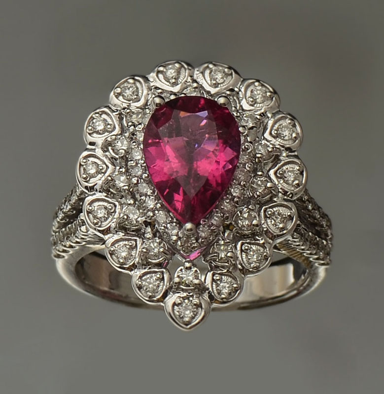 14K TOURMALINE & DIAMOND RING: 14K white gold ring contains 75 round full cut diamonds. Weight: .75 Ct. Approx. Rated SI-I1 in clarity and G-H in color. One pear mixed cut tourmaline. Weight: 1.85 Ct. Approx. Rated VS in clarity (Type II), stpR in Hue, in Tone and 3 in Saturation. The tourmaline and diamonds are prong set. Weight: 7.3 grams. Size: 6