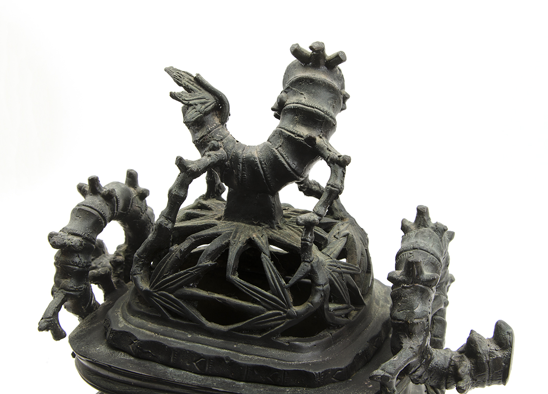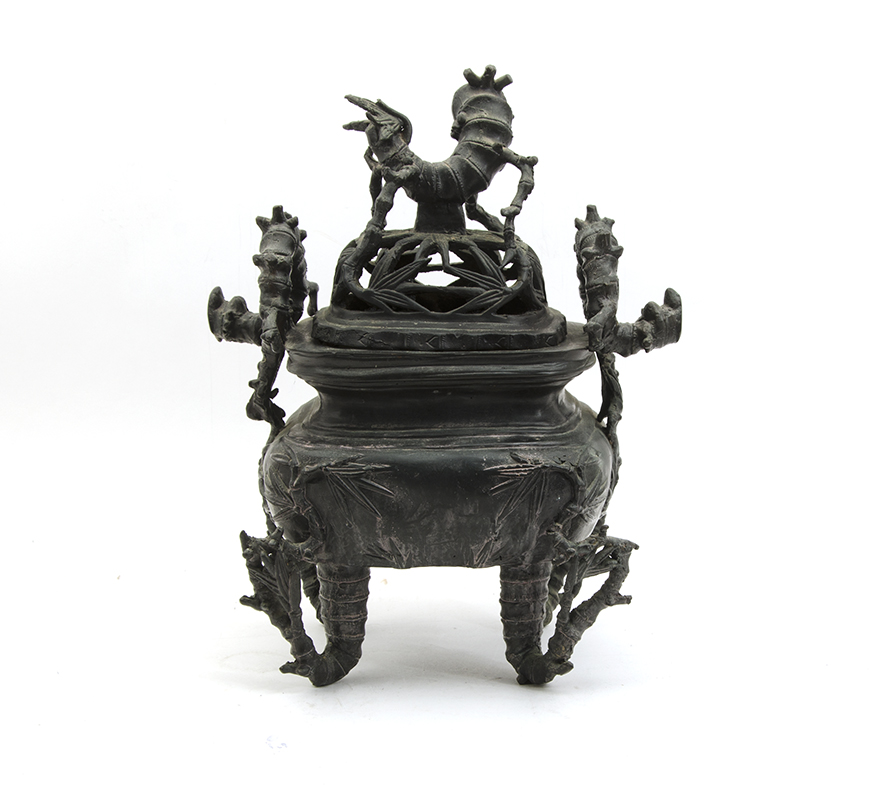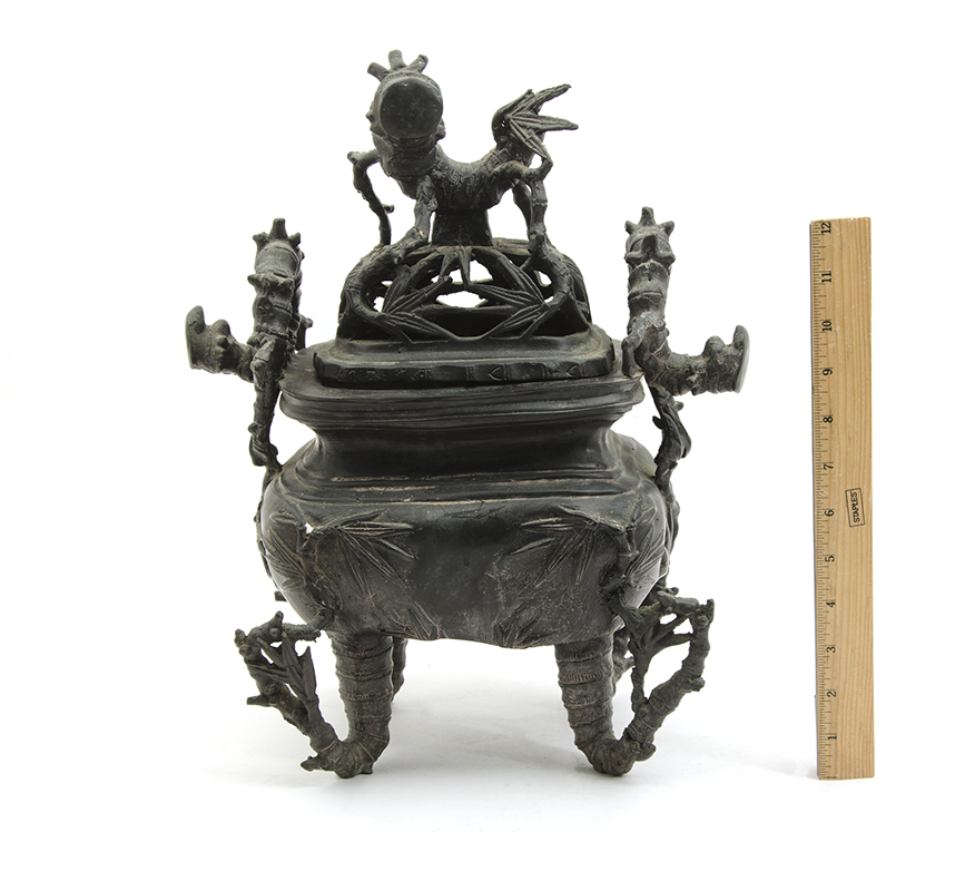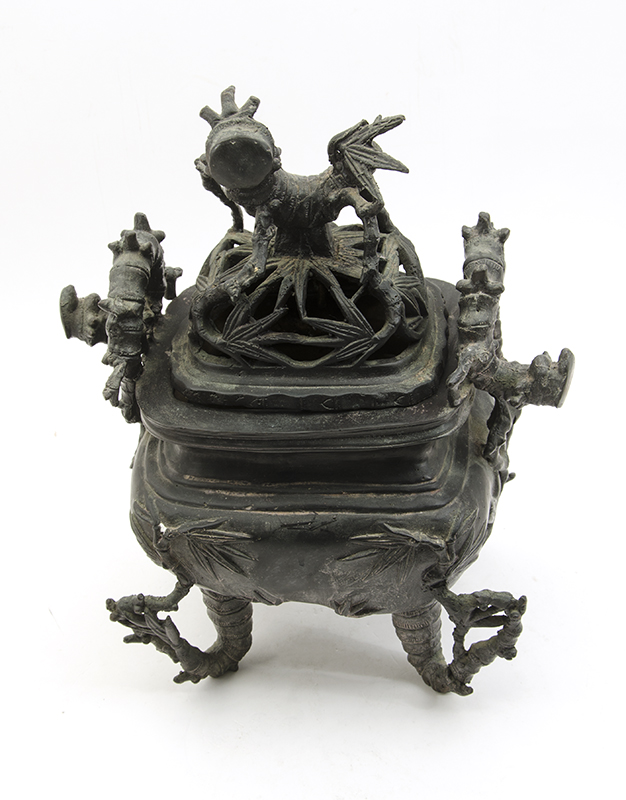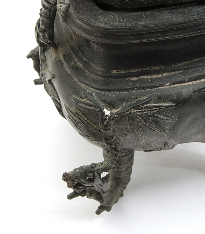 CHINESE BRONZE BAMBOO & CHUTES CENSER: Reticulated top, solid body on 4 bamboo feet, bamboo handles. No visible signature or marking, overall 15'' h. x 12 1/2'' x 8 1/2''.