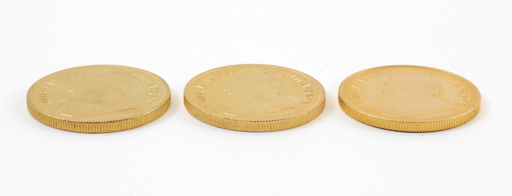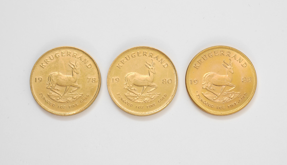 3 SOUTH AFRICA GOLD KRUGERRAND COINS: Dates 1978, 1980 and 1983, ungraded, 3 troy oz. pure gold, total weight 3.27 troy oz.