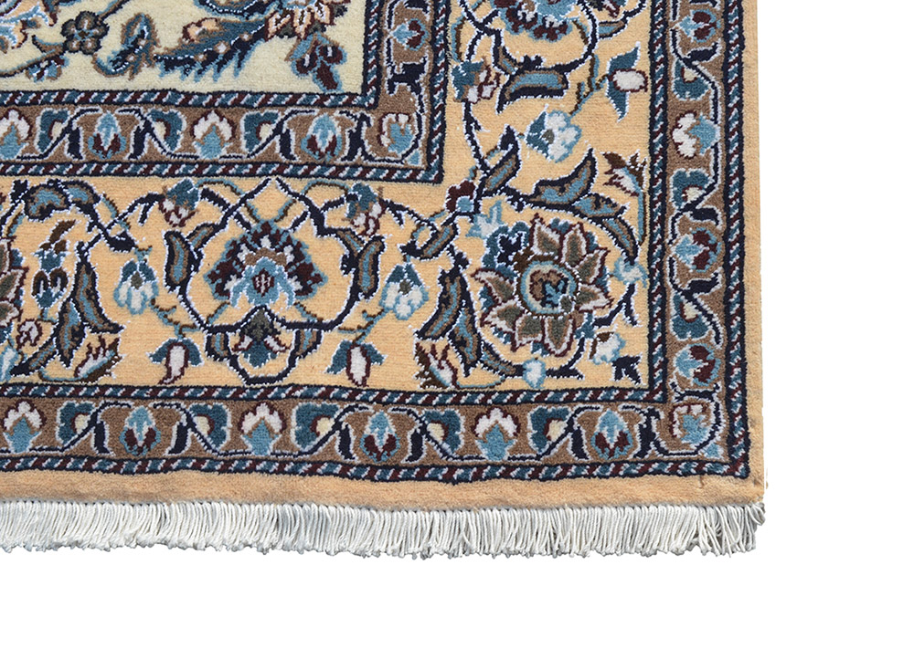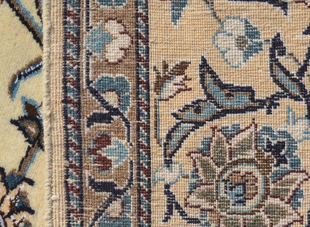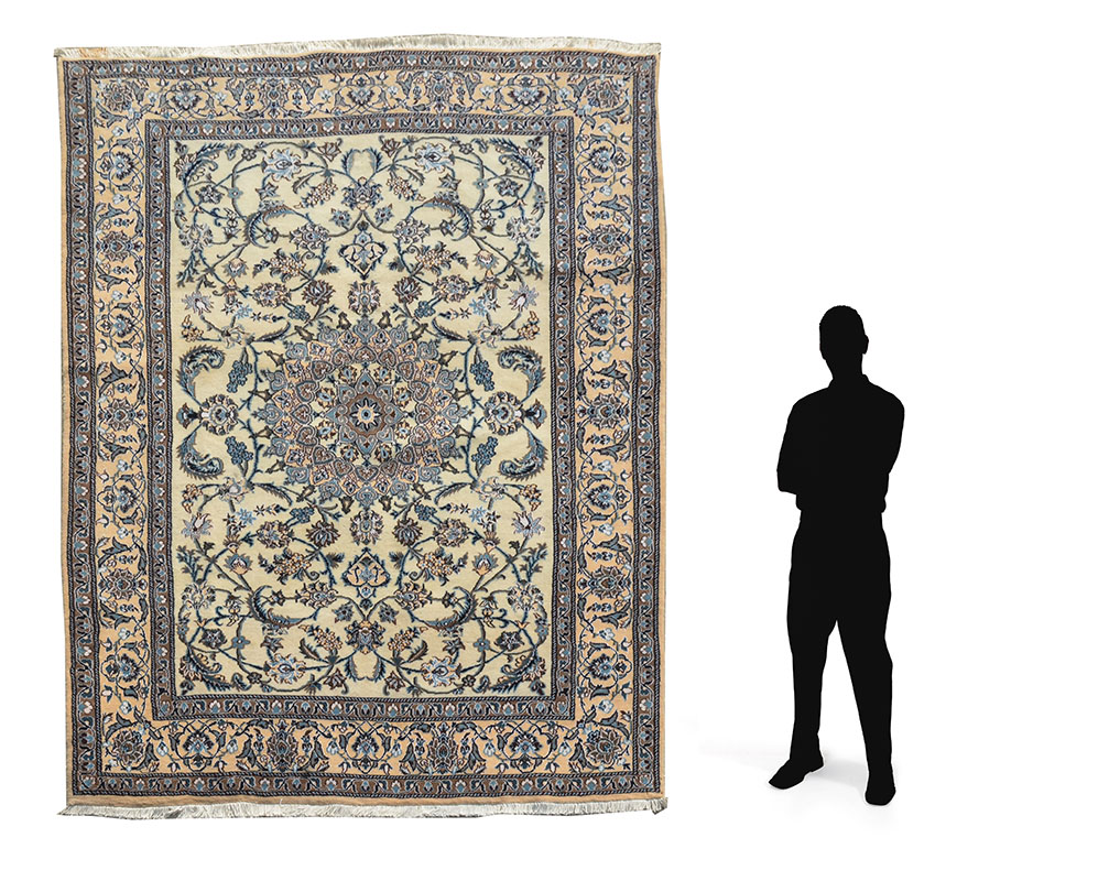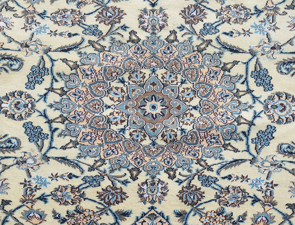 APPROX 20-35 YR OLD PERSIAN NAIN HAND KNOTTED WOOL AND SILK RUG, 6'5'' X 9'2'': This rug has very detailed design work that includes a round medallion within a medallion done in colors that include shades of blue, beige, and white. The ivory field is further covered with vines linking palmettes, large leaves, and clusters of flowers all in the same colors as the medallion. The borders continue the colors and gracefully drawn curvilinear designs.