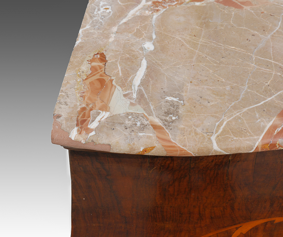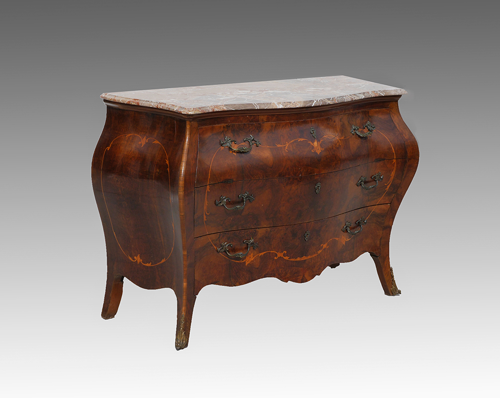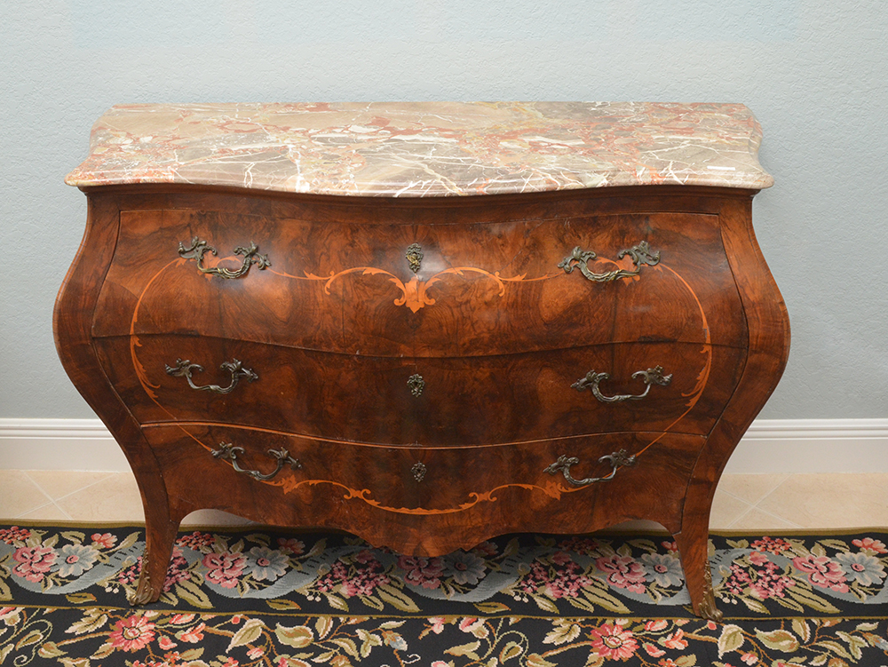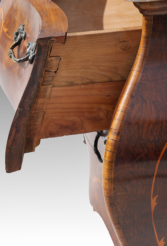 MARBLE TOP MARQUETRY INLAID BOMBE CHEST: Variegated grey marble top over 3 drawer bombe chest. Rosewood veneer, fruitwood marquetry inlaid foliate scroll decoration on front and sides. Overall measures 37 1/2'' h. x 54'' x 22''.