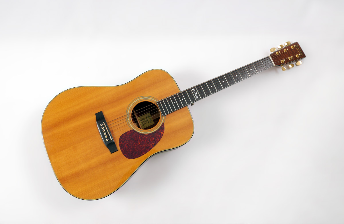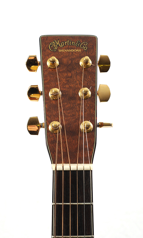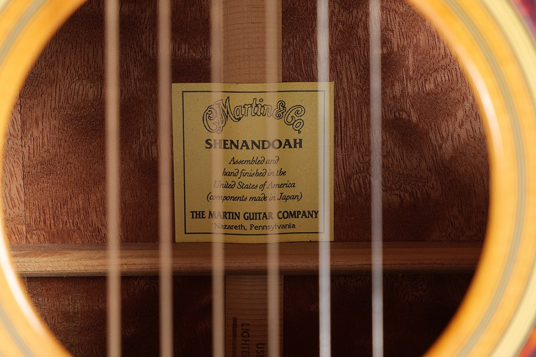 1992 MARTIN SHENANDOAH D-1932 ACOUSTIC GUITAR: Model D-1932 with quilted mahogany veneer, well marked on head and labeled interior, gold hardware, inlaid filigree on 15th fret, overall measure 41 1/4'' x 15 3/4'' x 5''. Sold with hard case, 43'' x 18'' x 6 3/4'', originally retailed for $1,250.