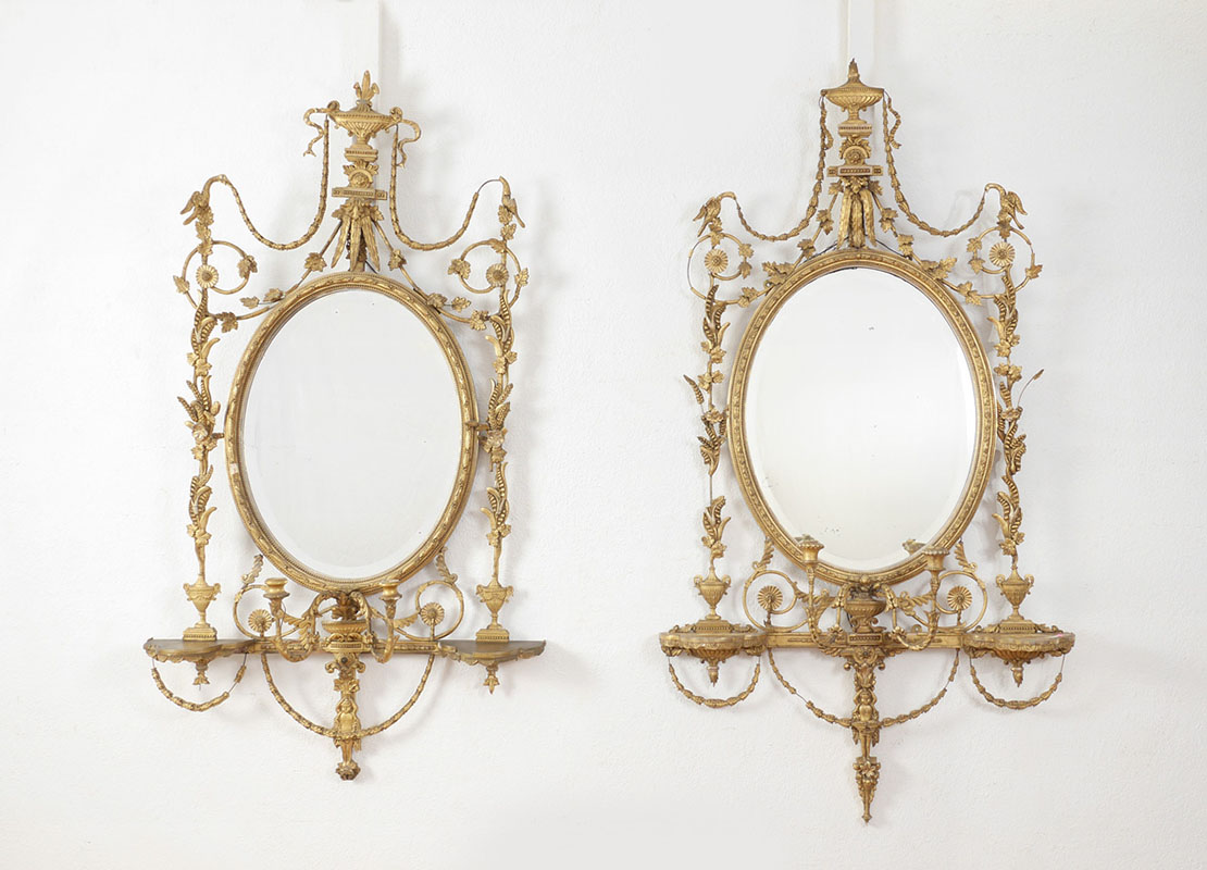 PAIR OF ADAMS STYLE CARVED GILTWOOD PARLOR MIRRORS: Nicely detailed gilt wood and gesso frames with urn, figural birds, bellflowers, wheat, other foliate and floral designs. Each mirror with 2 candle holders and 3 candle shelves, electrified at some point, no longer function and converted back to candle power. Beveled glass oval mirror, overall frames measure 61'' x 30'' x 6 1/2''.