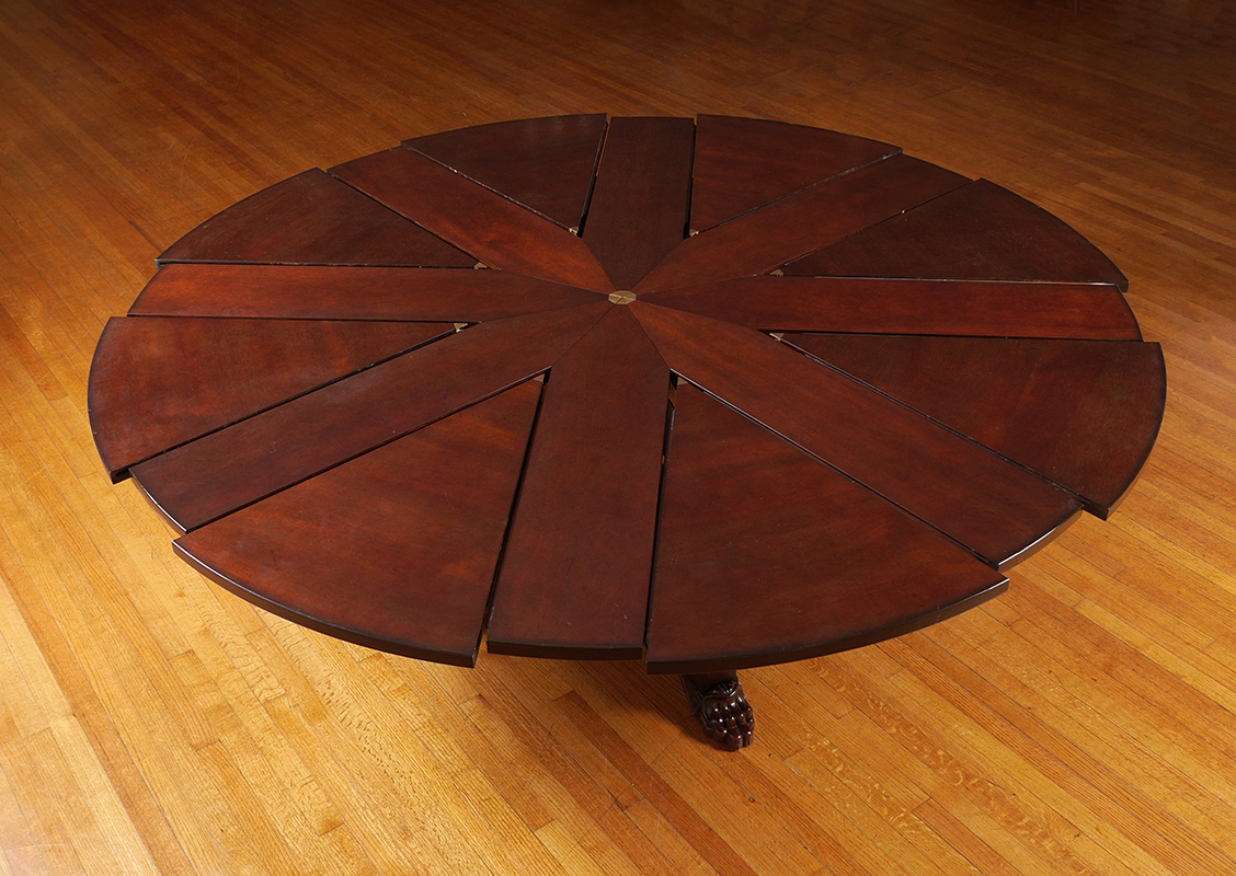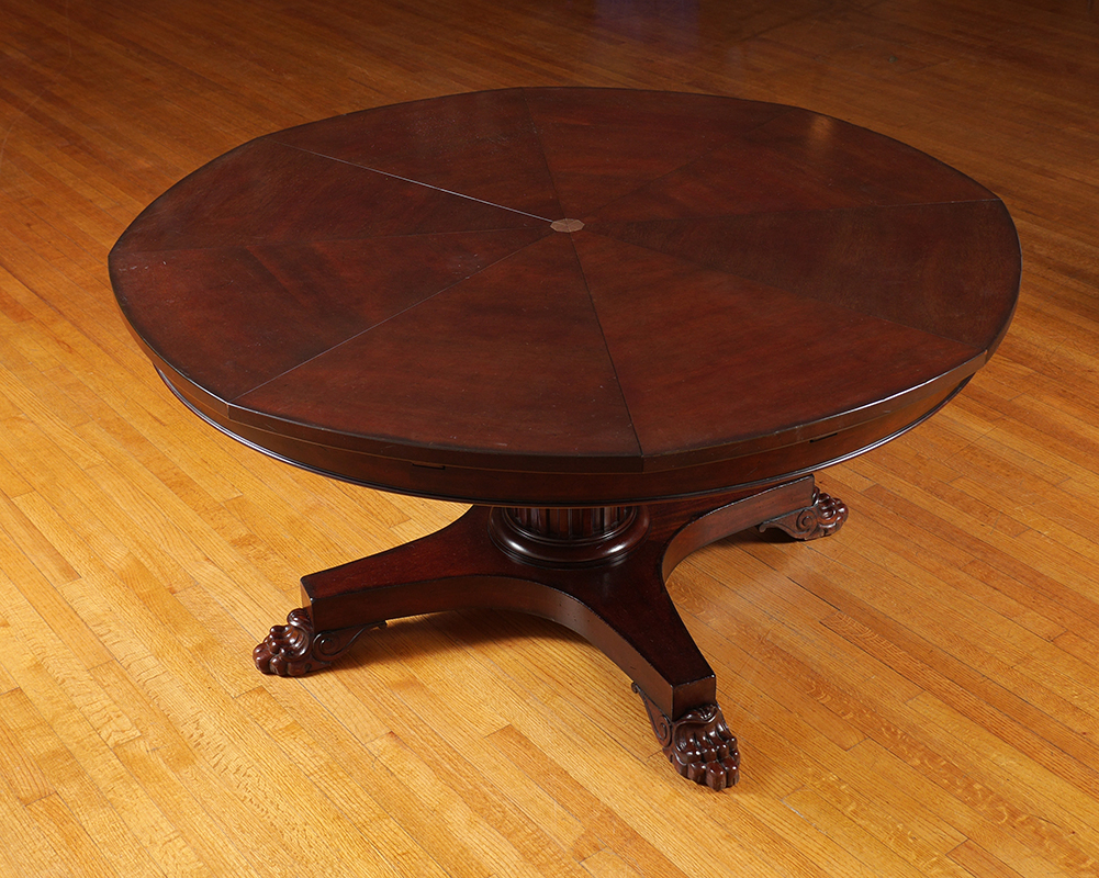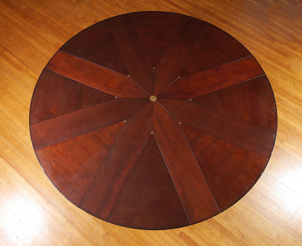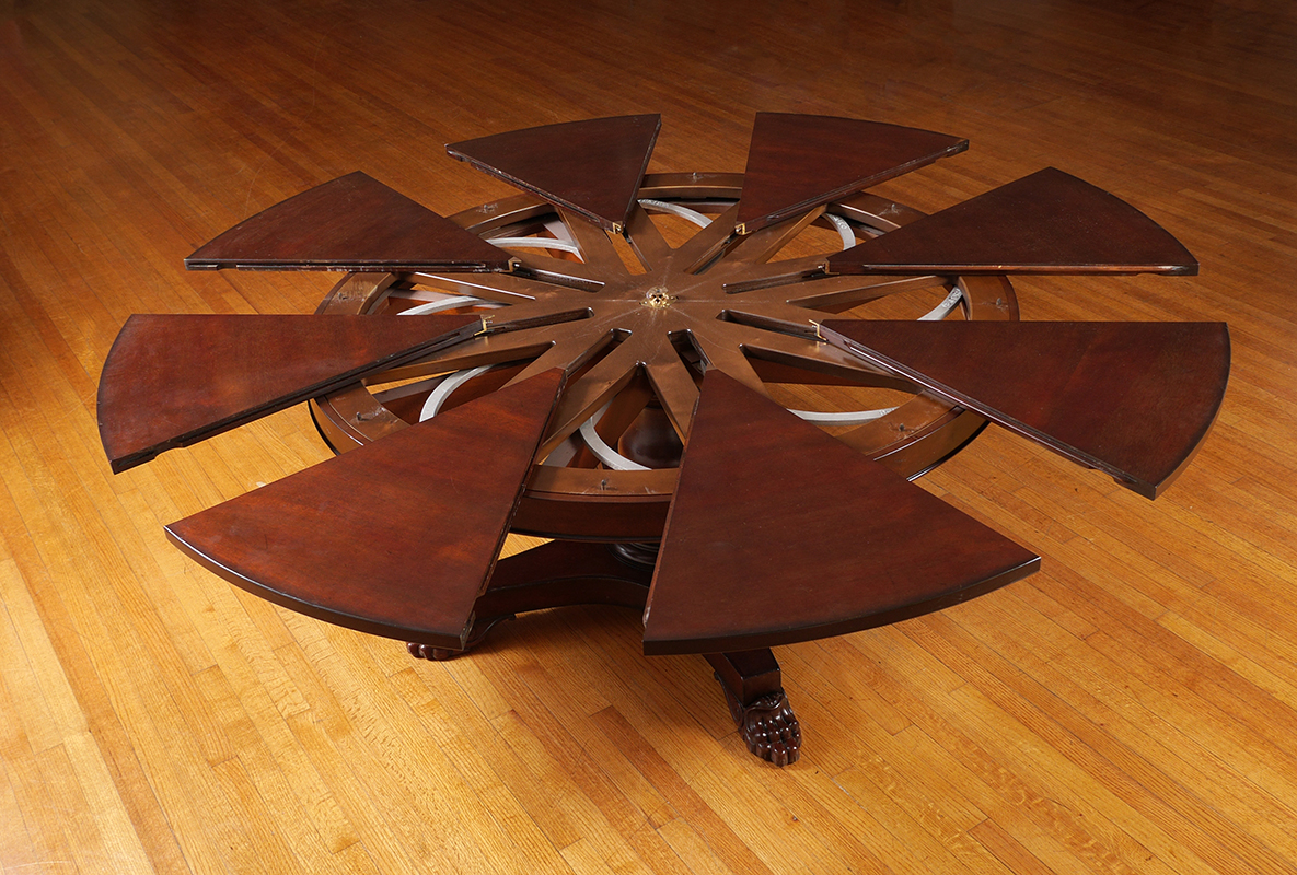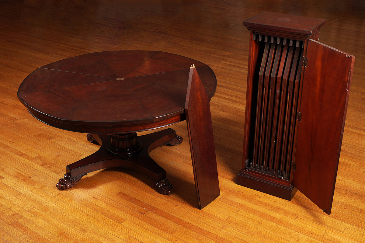 CENTURY JUPE MECHANISM TABLE FOR OSCAR DE LA RENTA: From the Oscar De La Renta collection by Century Furniture, round dining table with the Jupe mechanism for expanding with 6 leaves. Top rotates and spreads to fully extended this table, measures 30 1/4'' h. x 84'' dia. Storage chest for leaves measures 51 3/4'' h. x 19'' x 14 1/4''.