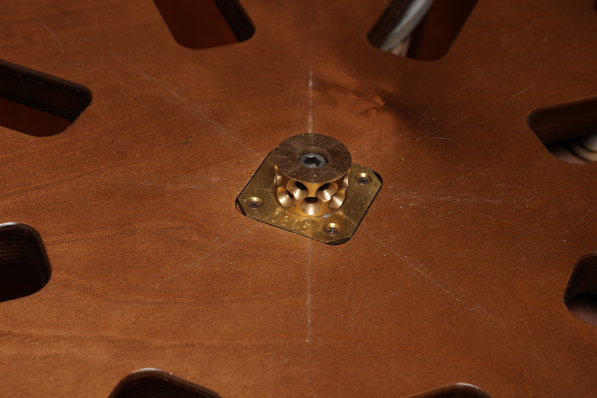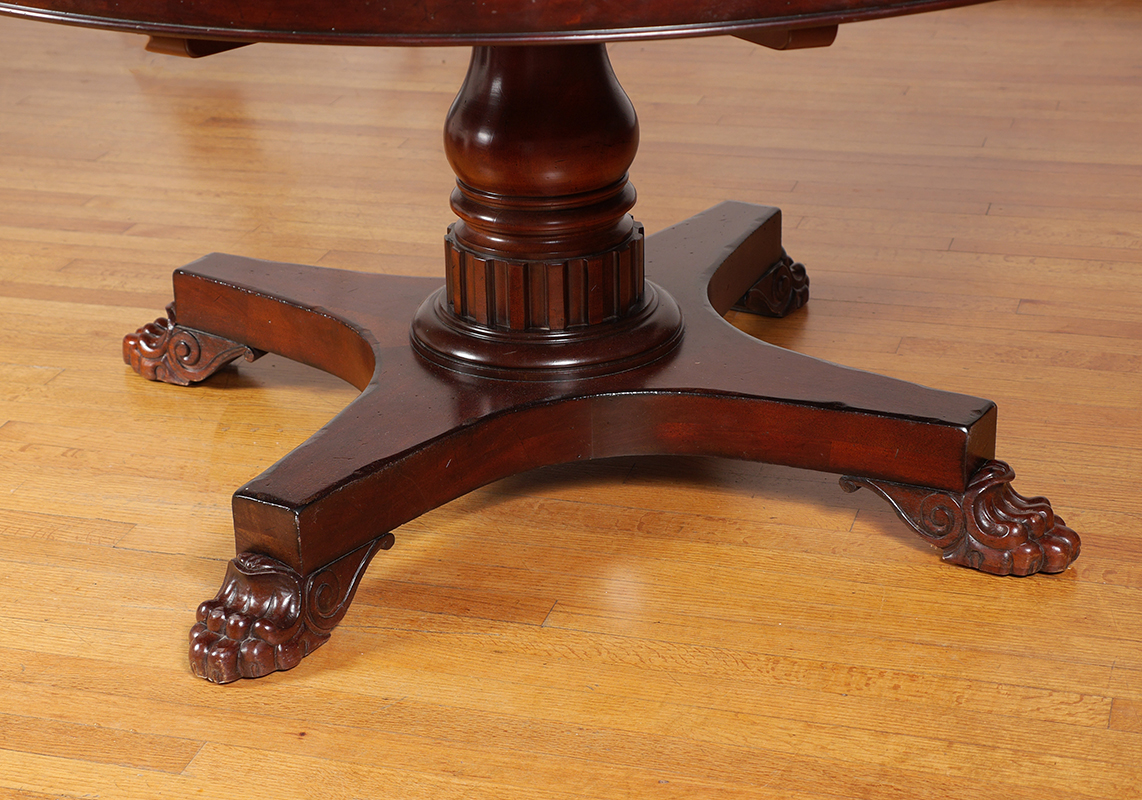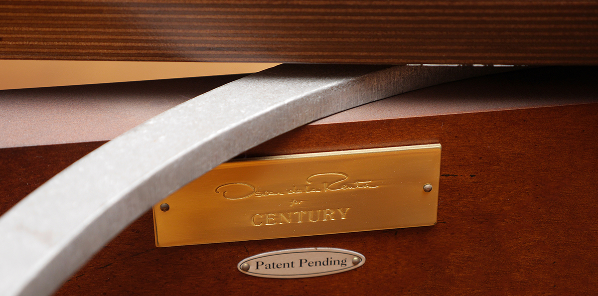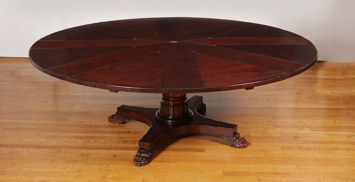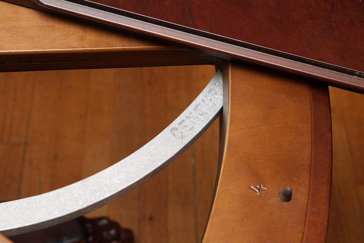CENTURY JUPE MECHANISM TABLE FOR OSCAR DE LA RENTA: From the Oscar De La Renta collection by Century Furniture, round dining table with the Jupe mechanism for expanding with 6 leaves. Top rotates and spreads to fully extended this table, measures 30 1/4'' h. x 84'' dia. Storage chest for leaves measures 51 3/4'' h. x 19'' x 14 1/4''.