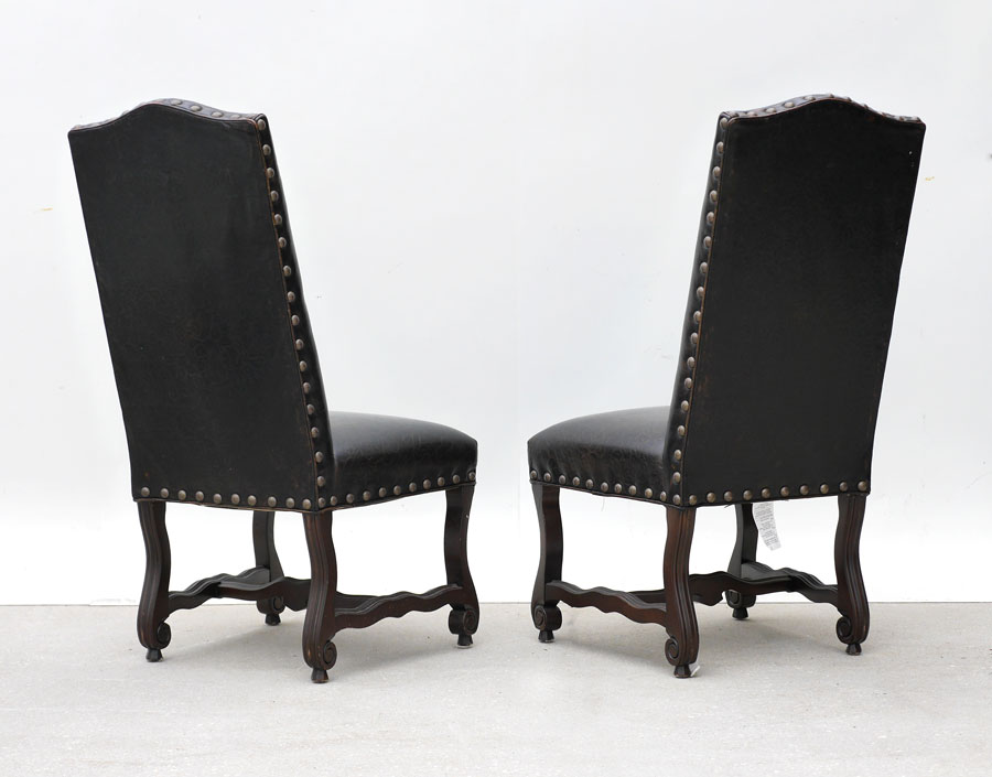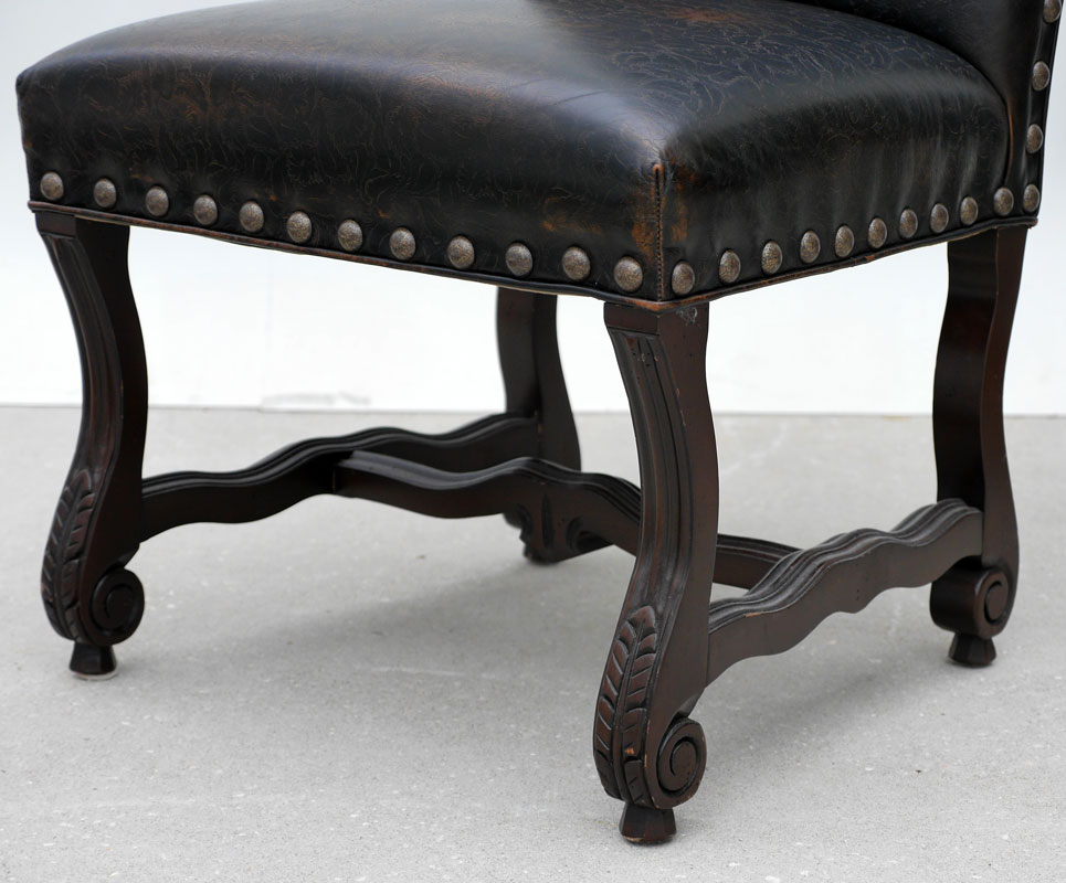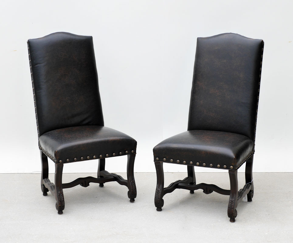 ROBB & STUCKY EMBOSSED LEATHER HIGH BACK CHAIRS: Tacked embossed leather with foliate scroll designs, carved and shaped legs and stretchers. Overall measures 47'' h. x 24'' x 26''.