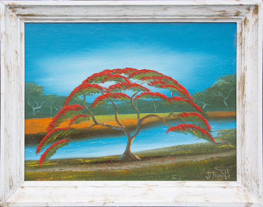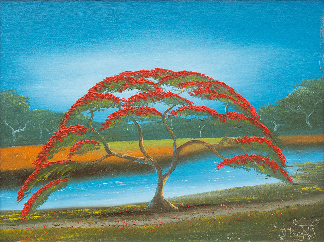 KNIGHT, Issac, (American, 20th Century): Florida Highwaymen Royal Poinciana at rivers edge, Oil/Upson, signed lower right, 18'' x 24'', framed 22'' x 27 1/4''.