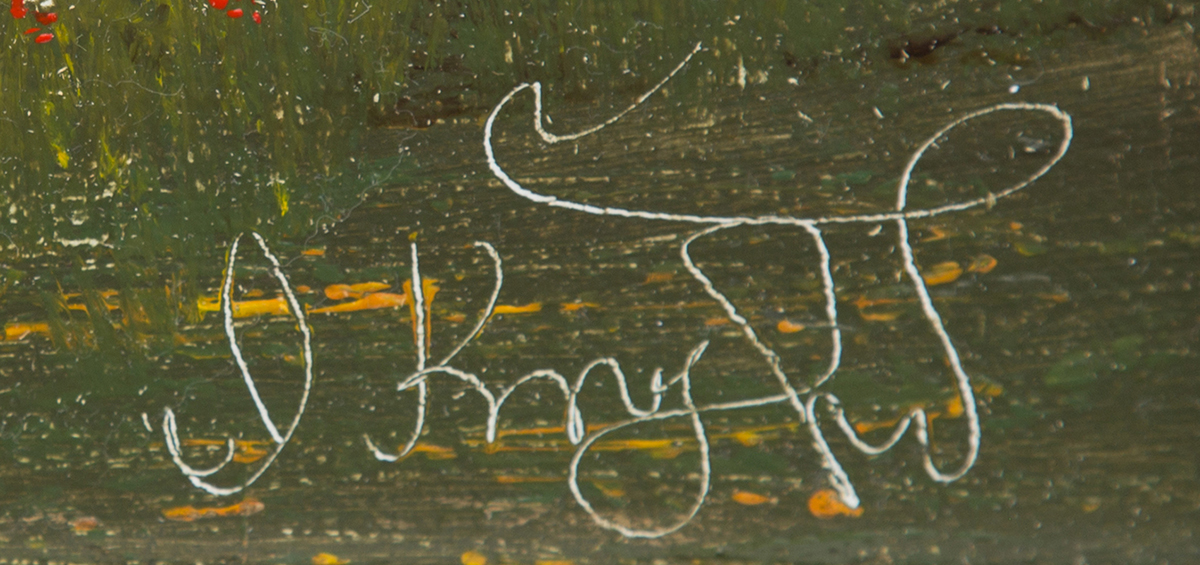 CONDITION: Minor repair to right side, back of painting with remnant design of old wall paper.