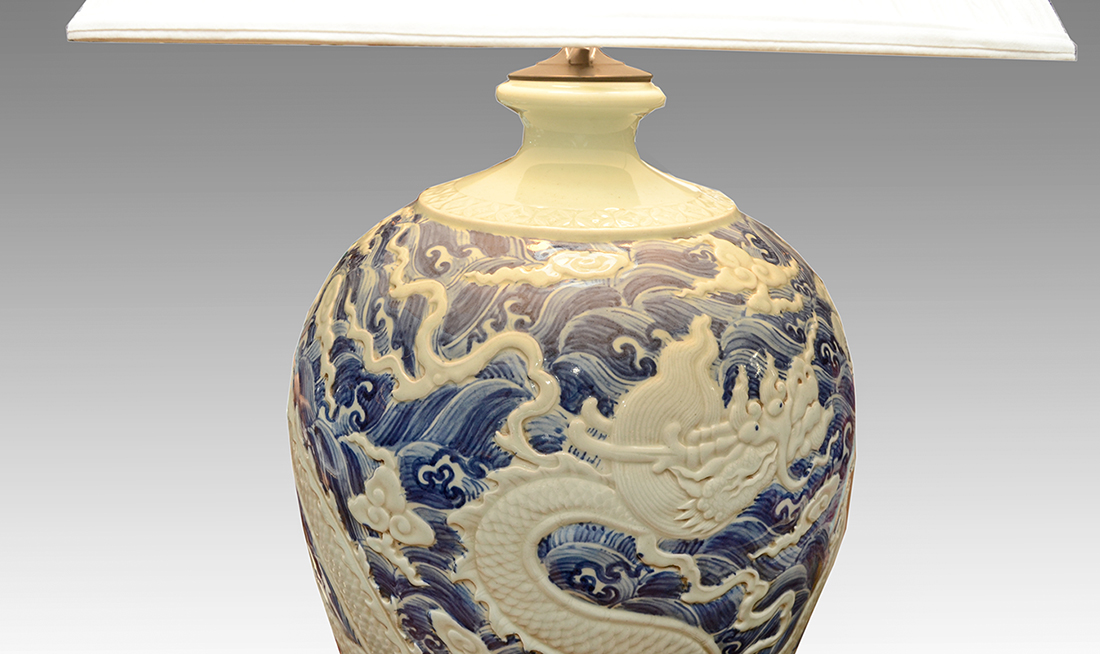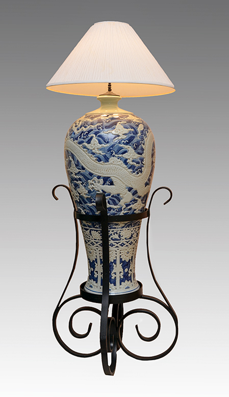 PALATIAL CHINESE BLUE & WHITE DRAGON LAMP IN IRON STAND: Baluster form ceramic body with relief dragon, clouds and foliate designs, blue waves background, single socket fixture, removable from the wrought iron stands. Overall measures 66'' h. x 25 1/2'' dia., cloth shades 12'' h. x 25 1/2''. For a pair see previous lot.