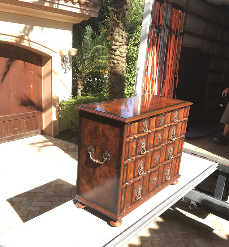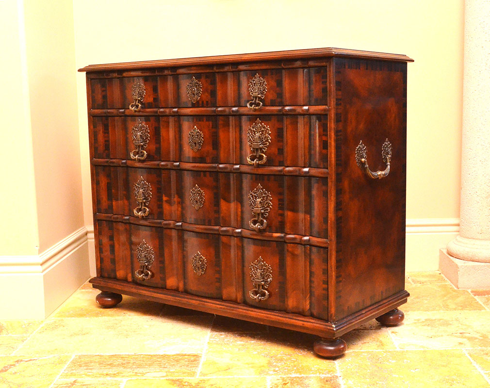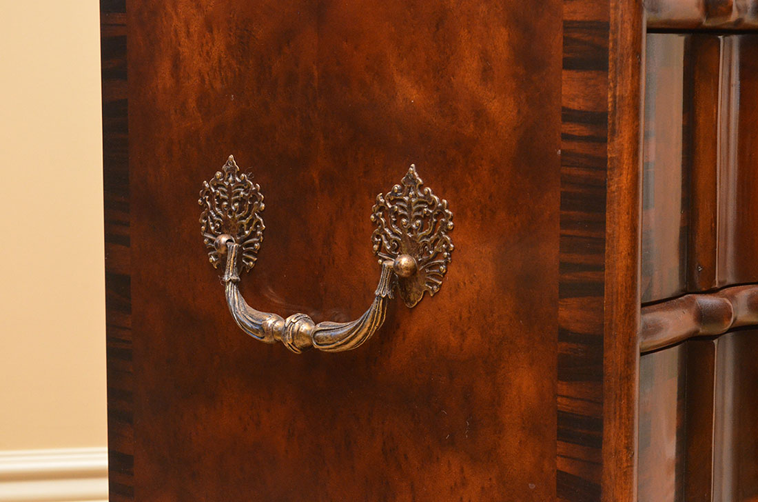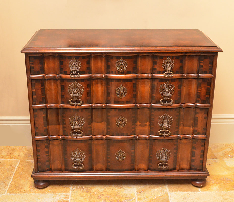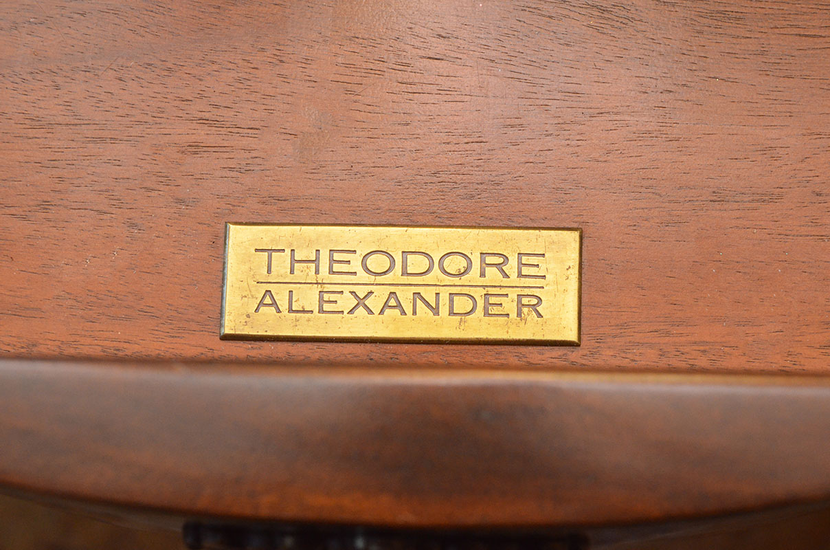 THEODORE ALEXANDER 4 DRAWER COMMODE: The 4 drawers having shaped fronts, decorative metal pulls and escutcheon, brass Theodore Alexander tags. Measures 33 1/2'' h. x 44'' x 20''. For a pair see previous lot.