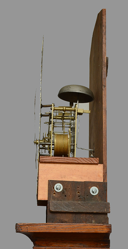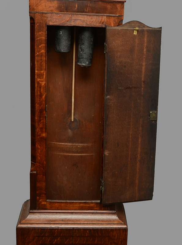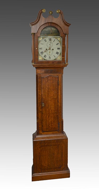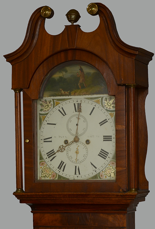 W. HOAG ENGLISH LONGCASE CLOCK: Broken arch pediment with brass accents, mixed wood case, mahogany accents and fluted full columns on bonnet. Painted metal dial with hunt scene vignette at top, floral motif in corners, partial dealer name W. Hoag, ?ill?ro. Overall measures 90 3/4'' h. x 21'' x 9 1/2''.