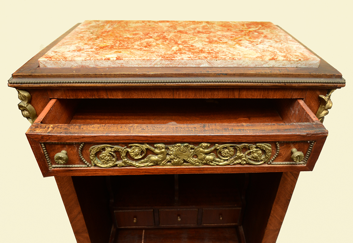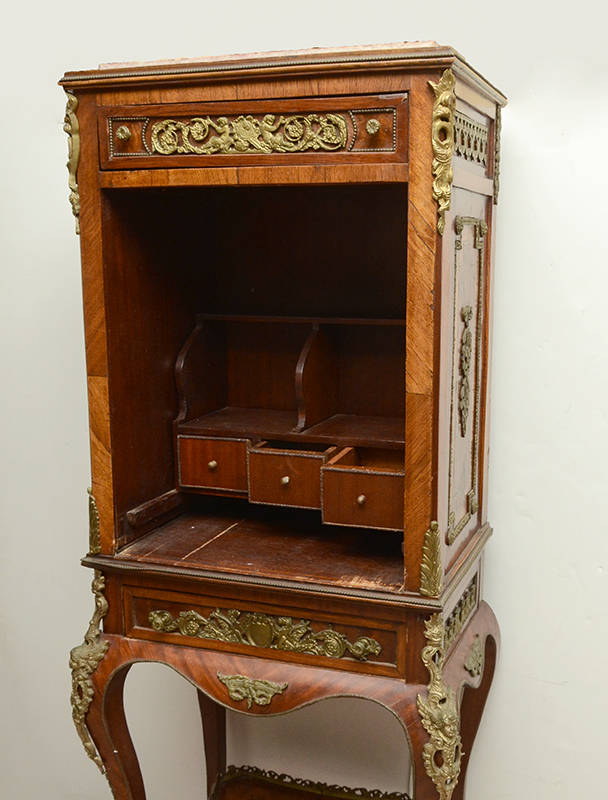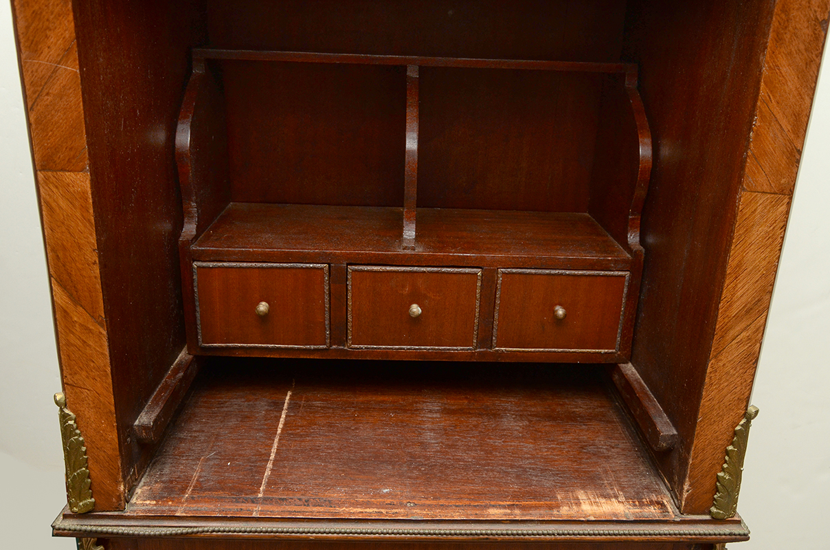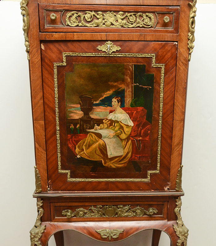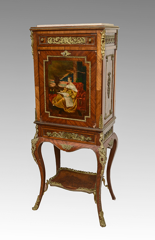 CONTINENTAL PAINT DECORATED SECRETAIRE ABBATANT: Loose inset marble top over single drawer over fall front door, paint decorated with interior genre scene of seated maiden writing. Interior with embossed leather writing surface, 3 drawers, pigeon holes. Shaped skirt and legs, open lower shelf. Applied cast metal decoration all over. Measures 60 3/4'' h. x 25'' x 17''.