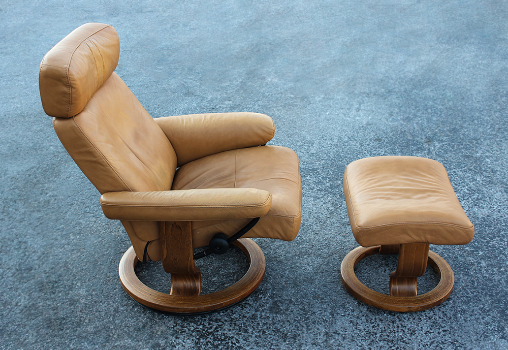 EKORNES STRESSLESS LEATHER RECLINER CHAIR & OTTOMAN: Tan leather upholstery with wood bases. Marked Stressless Ekornes on knobs. Chair 38'' h. x 30'' x 29 1/2'', matching ottoman 16 3/4'' h. x 21 1/4'' x 19''.
