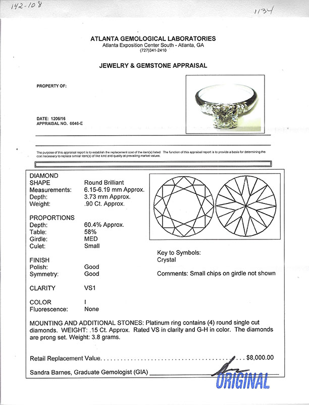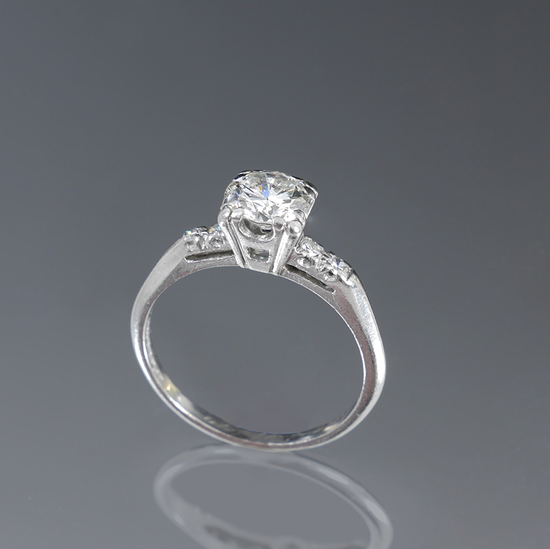 PLATINUM MID-CENTURY DIAMOND SOLITAIRE RING: .90 CT round brilliant cut diamond is rated VS1 in clarity and I in color. 4 round single cut diamonds weigh .15CT approx, are rated VS in clarity and G-H in color. Size 6.5. Total weight 3.8 grams. Sold with current Atlanta Gemological GIA graduate's appraisal for $8000.