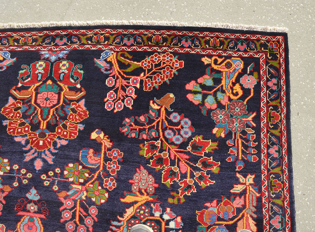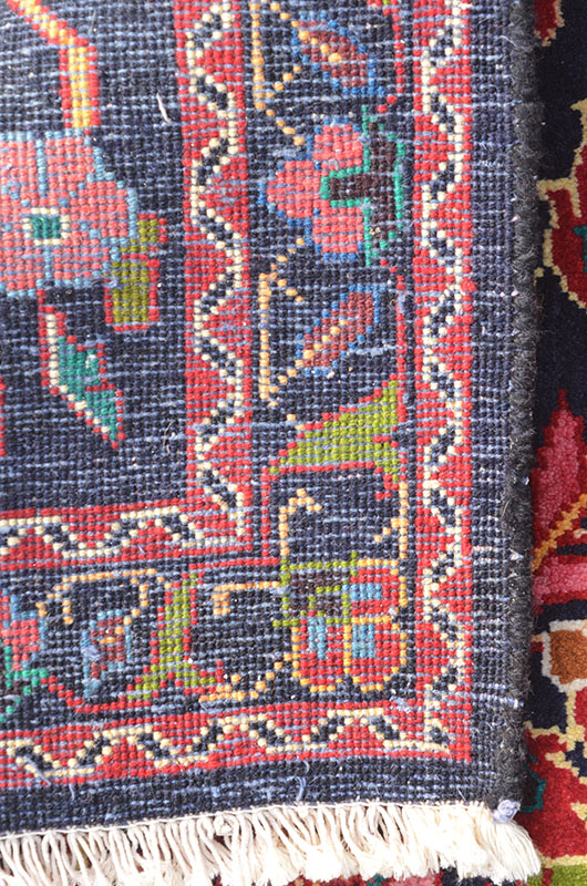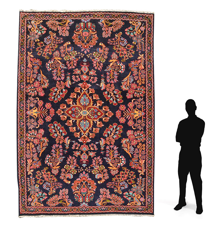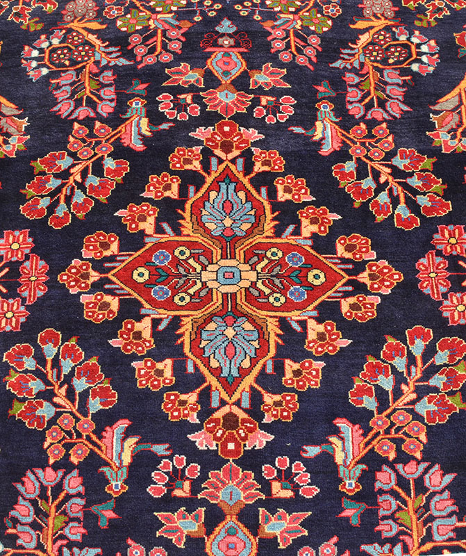 APPROX. 25-40 YR OLD PERSIAN HAND KNOTTED WOOL RUG, 6'10'' X 9'11'': This pretty rug has motifs and colors like an antique Sarouk or Isfahan. The dark blue field has sprays of various type and color flowers not linked to each other but surrounded by the solid blue of the field. The central medallion also has the same treatment. The colors are clear and strong and include yellow, pink, turquoise, green, red, white, and shades of blue.