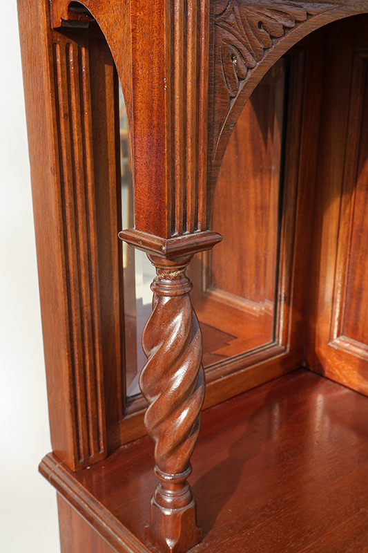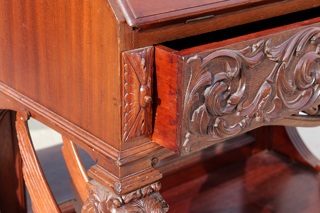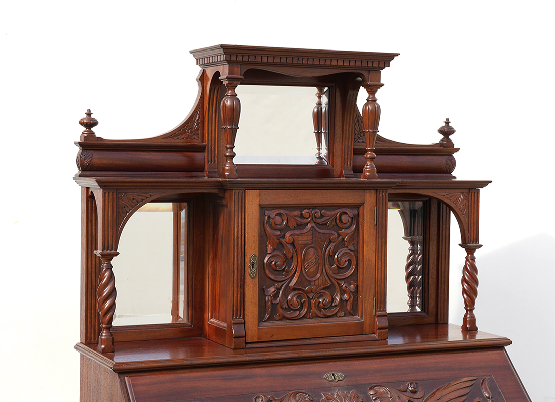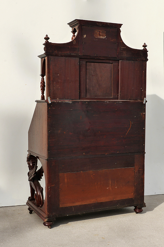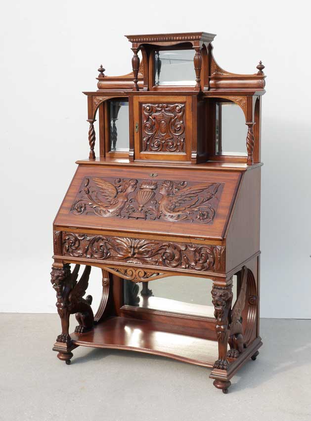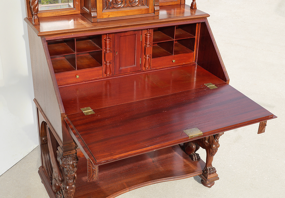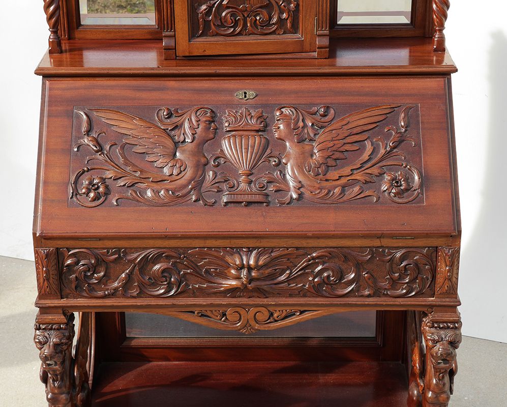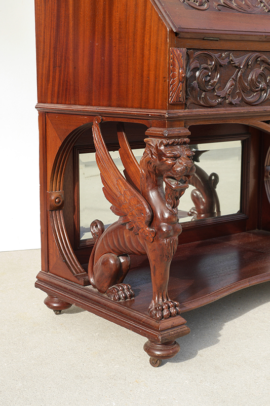 HORNER QUALITY MAHOGANY CARVED GRIFFIN SECRETARY DESK: Top with center carved door surmounted by 3 beveled glass mirrors, open shelf, carved and turned supports. Slant fall front door with carved winged masquerons and urn design, interior with door, drawers, and pigeon holes. Full length drawer, north wind and foliate front, carved full figural griffin supports, lower petticoat mirror. All on bun feet with castors. Overall measures 65'' h. x 37'' x 22''.