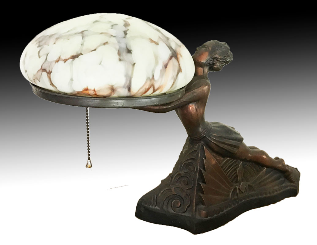 ART DECO FIGURAL MAIDEN TABLE LAMP: Patinated spelter figure of a maiden with outstretched arms lying on a hollow art deco design base, single socket fixture, 10 3/4'' h. x 19'' x 8 1/4''. Sold with variegated glass shade, 3 1/4'' h. x 8 3/4'', fitter rim 7 3/4'' dia.
