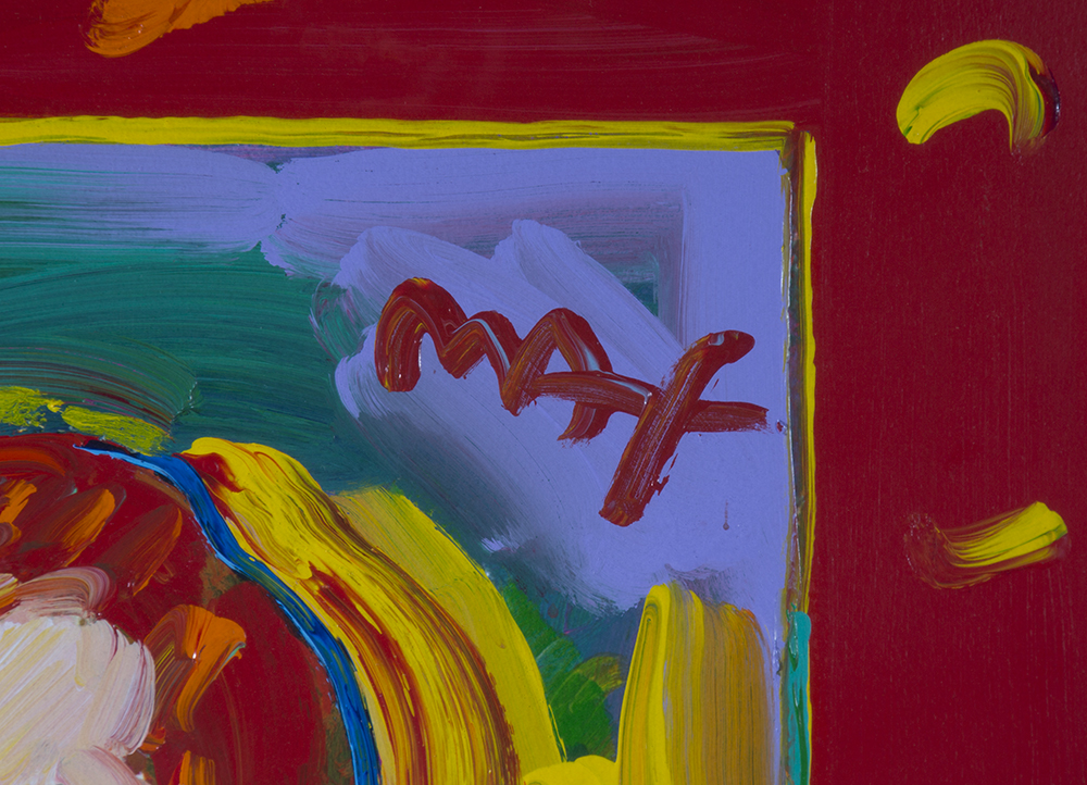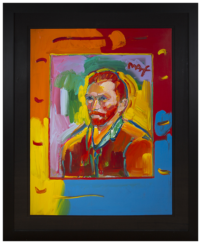 MAX, Peter, (German, 1937-): Portrait of Van Gogh, Mixed Media on Paper, 39.5'' x 29.75'', signed upper right, custom black cloak mounted in custom black frame, 52.25'' x42.25'', hand drawn vignette verso and dedication to Mike dated 2013, sold with COA. Peter Max is an American artist known for using bright colors in his work.