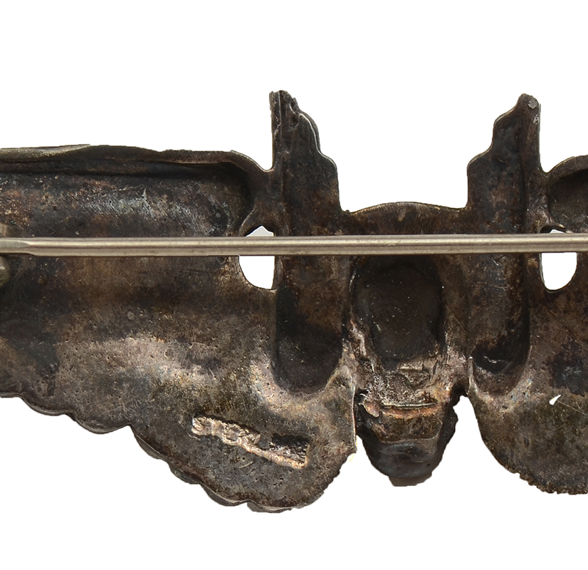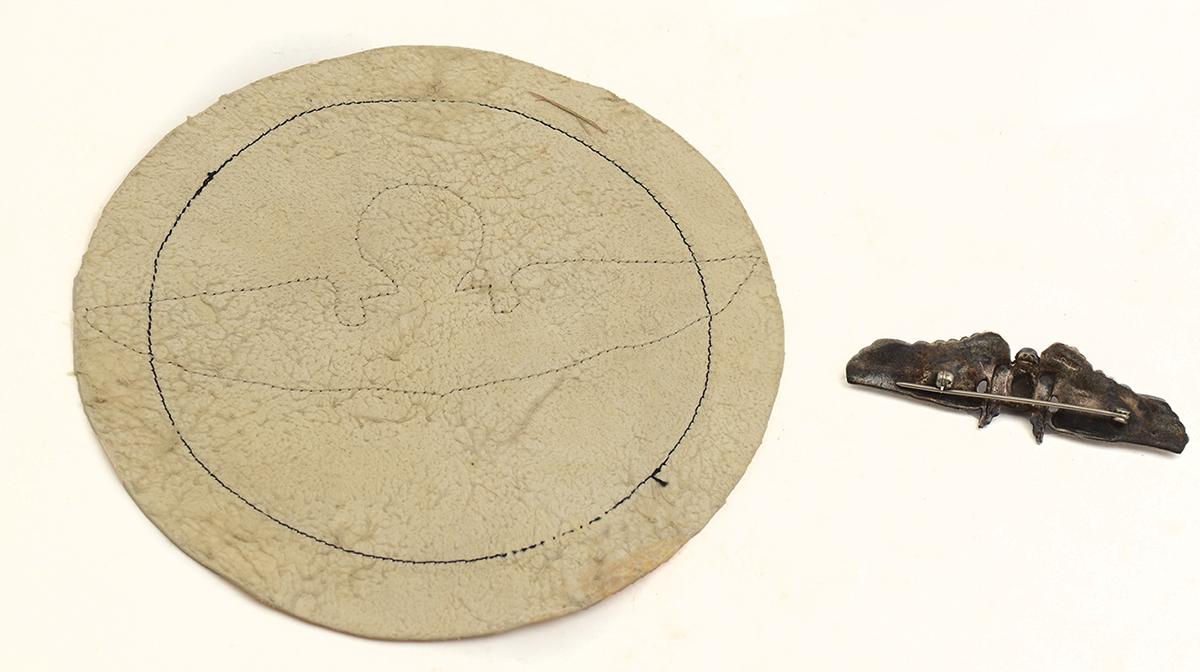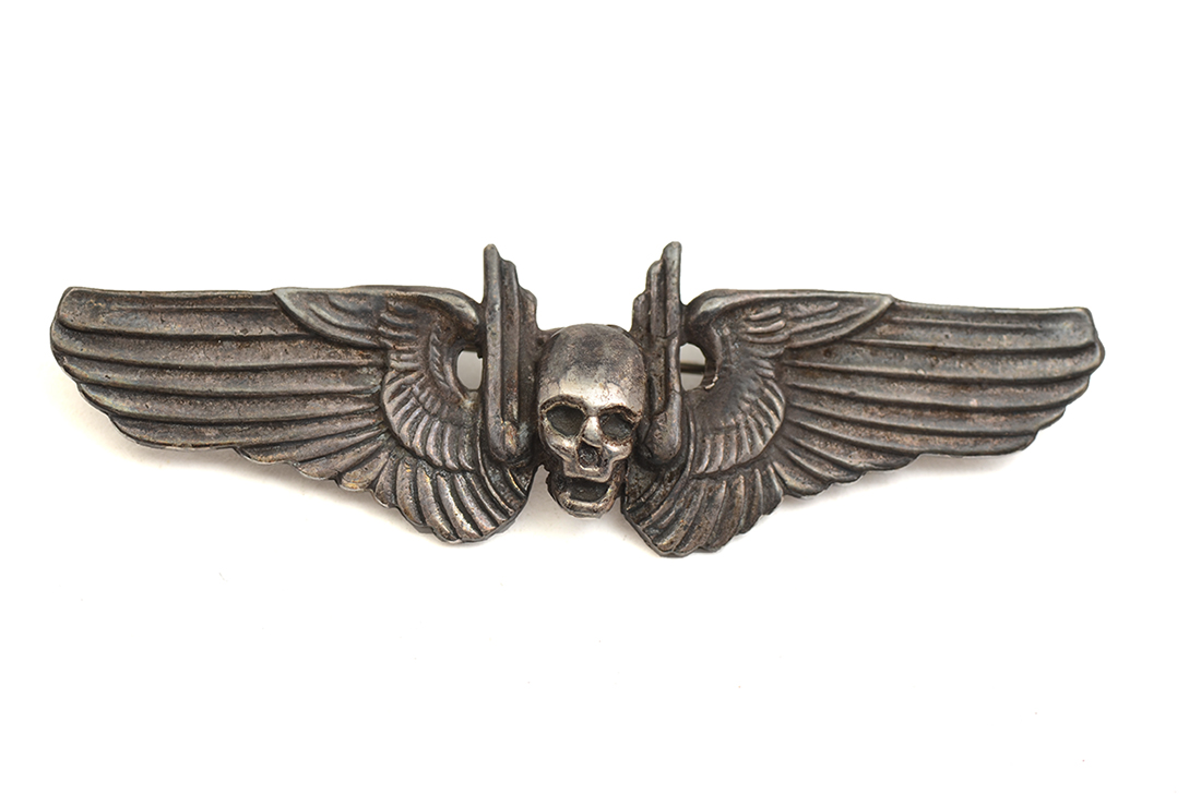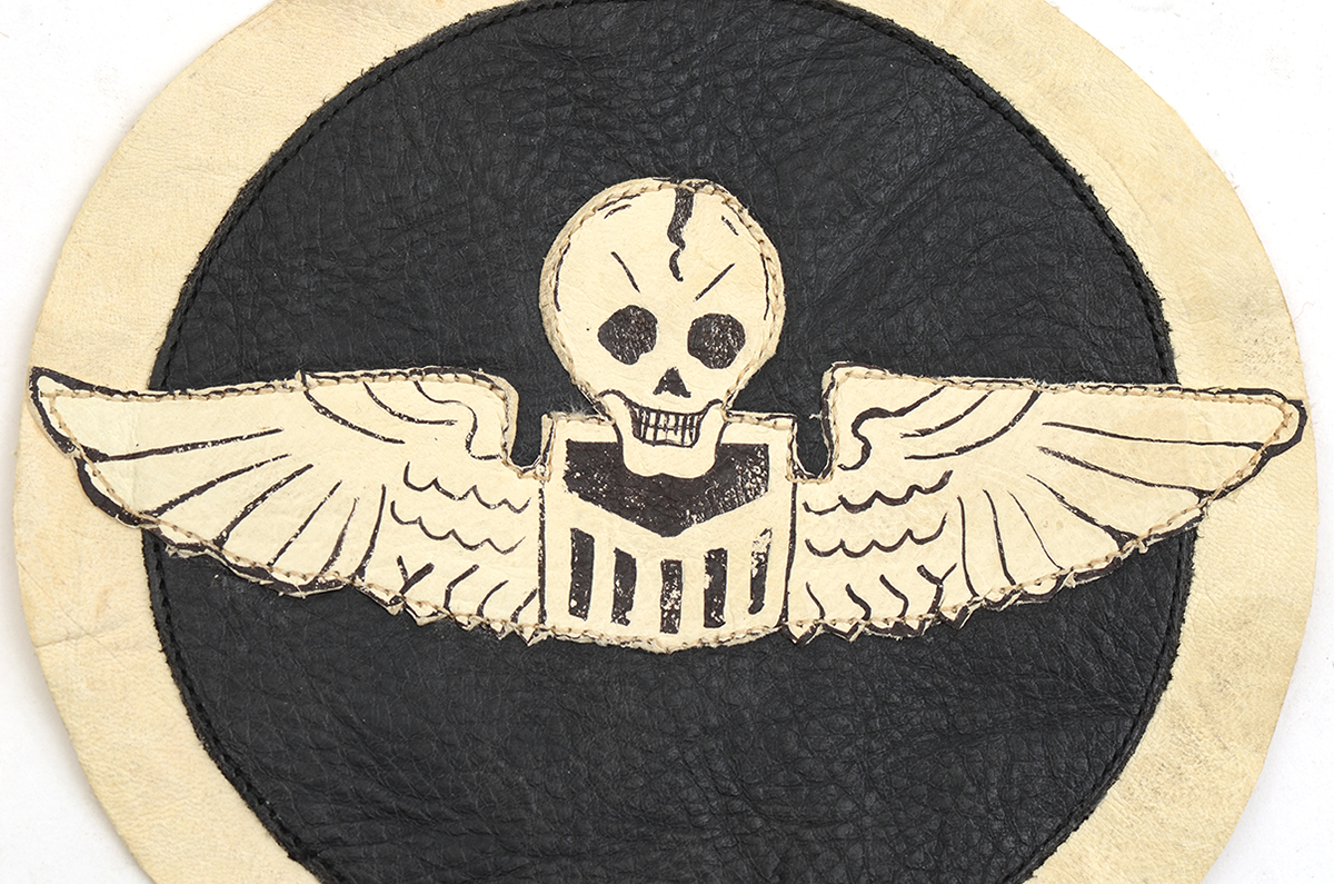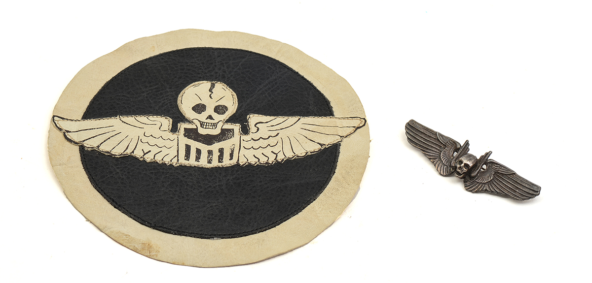 2 WWII US ARMY AIR FORCE BOMBARDMENT INSIGNIAS: 2 pieces total to include 1) 490th Bombardment Group leather patch with skull over wings, 5 3/8'' dia. 2) Sterling wing attributed to the 490th with an unusual winged skull in the center replacing the bomb, most likely custom made, 2 5/8'' wide.