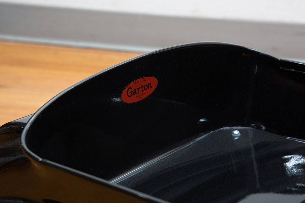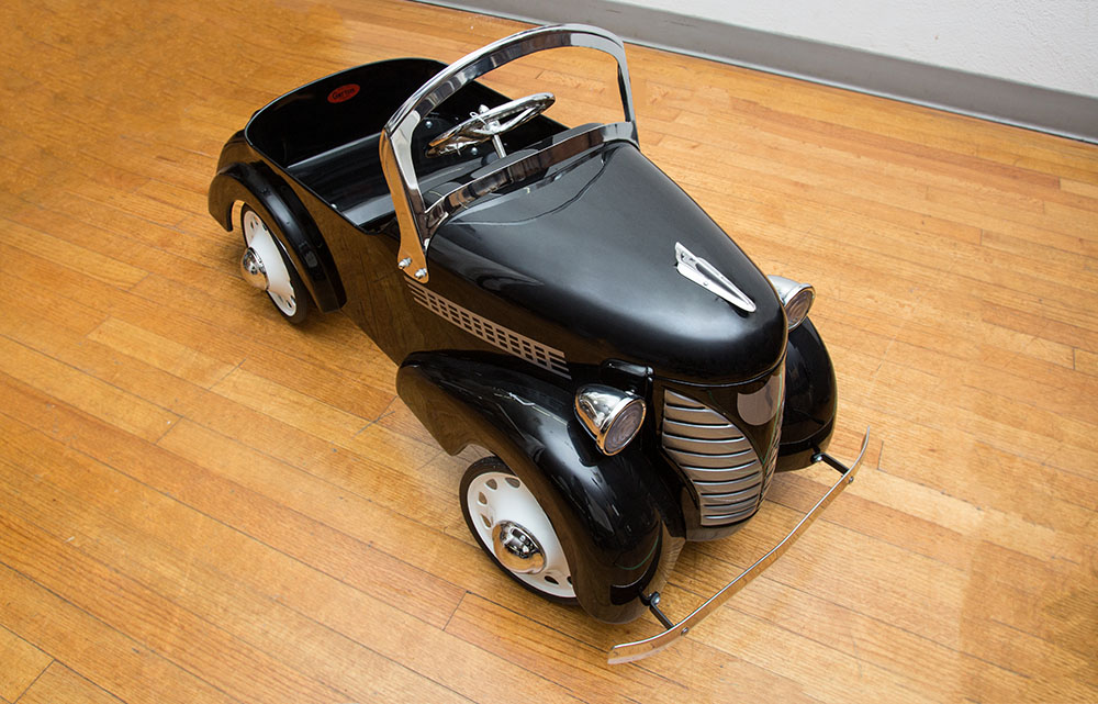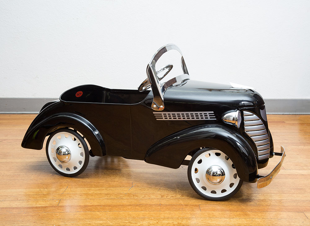 1937 GARTON FORD PEDAL CAR: Professionally restored to it's original glory, black paint with grey accents, chrome accessories. Overall measures 22'' h. x 41 1/2'' x 18''.