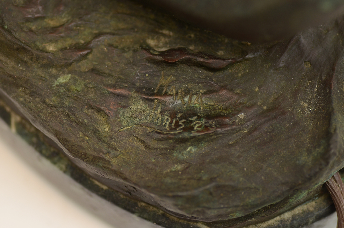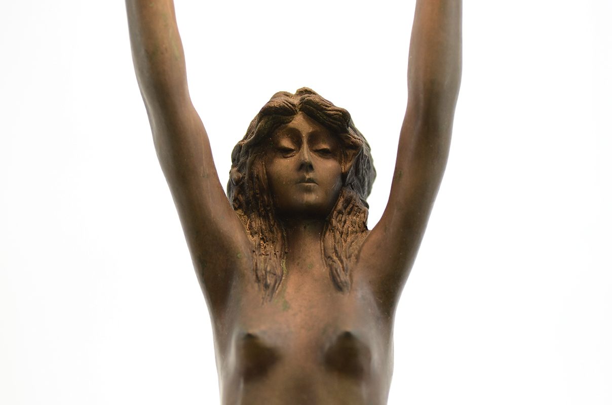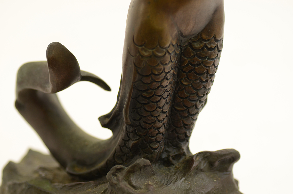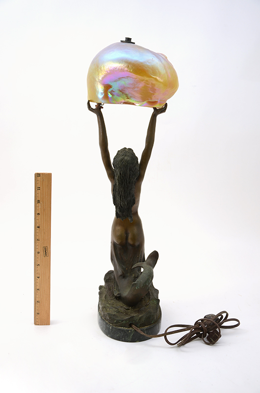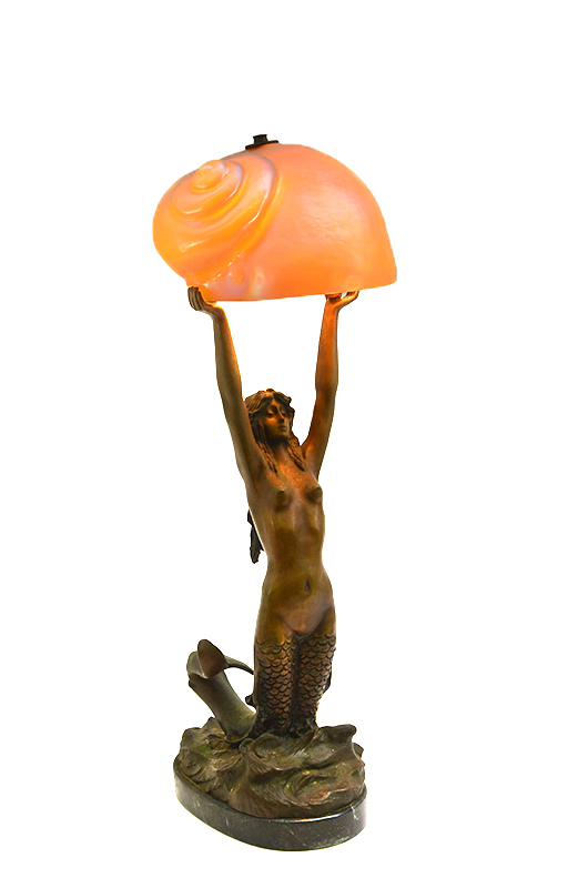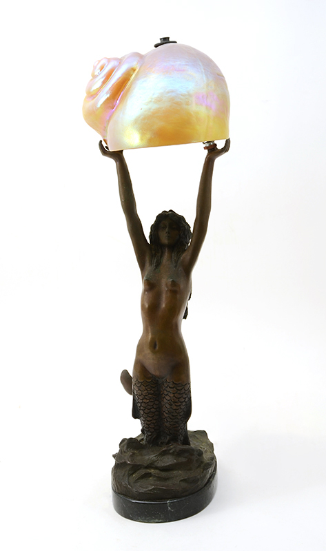 MARIA PARIS NAUTILUS SHADE NUDE MERMAID LAMP: Figure of a mermaid on crashing waves with upstretched arms holding a glass nautilus form shade. Signed Maria Paris, marble plinth, overall measures 22 1/4'' h. x 7'' x 8 3/4''.