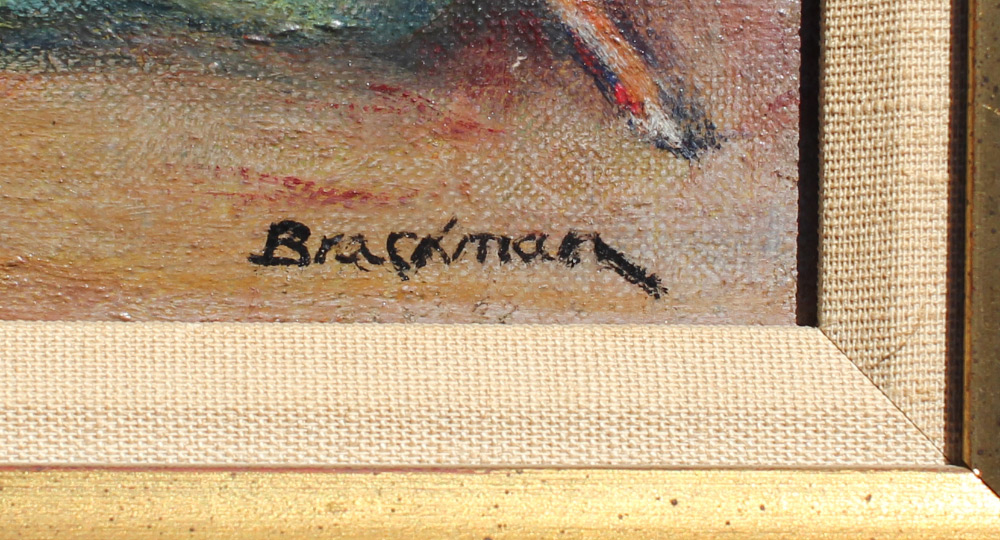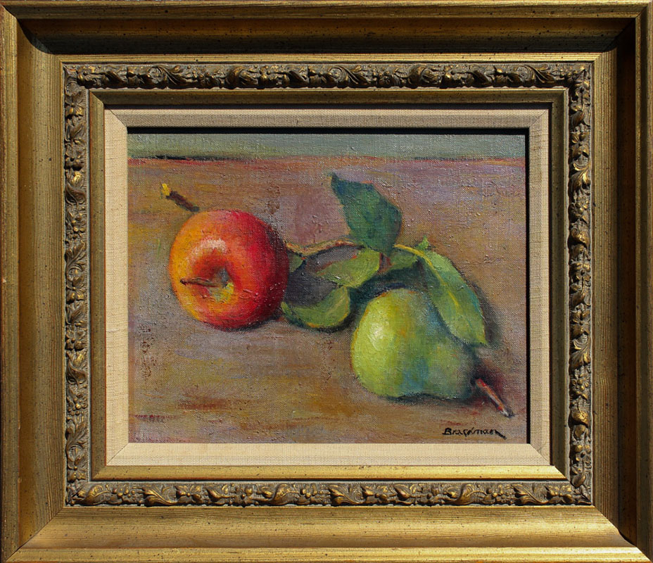 BRACKMAN, Robert, (Russian, 1898-1980) Still Life Painting of Apple and Pear, Oil/Canvasboard, 8'' x 10'', signed lower right, framed 12.5'' x 14.5''. Sold with cancelled check issued to Brackman from 1972 for the painting.