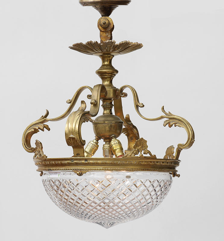 BRASS & CUT CRYSTAL CHANDELIER: Heavy cast brass frame with foliate scroll arm supports, round cut crystal half dome shade, overall 19'' h. x 16'' dia.