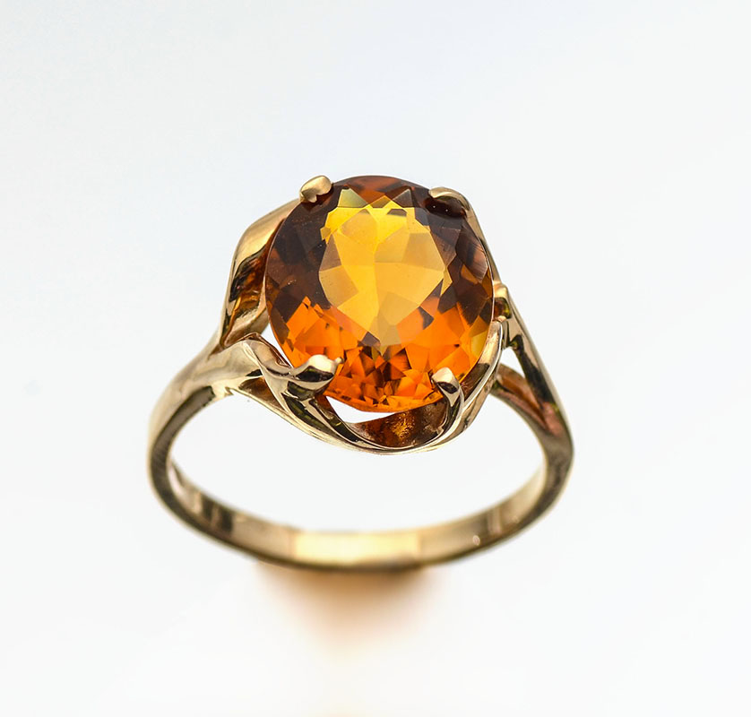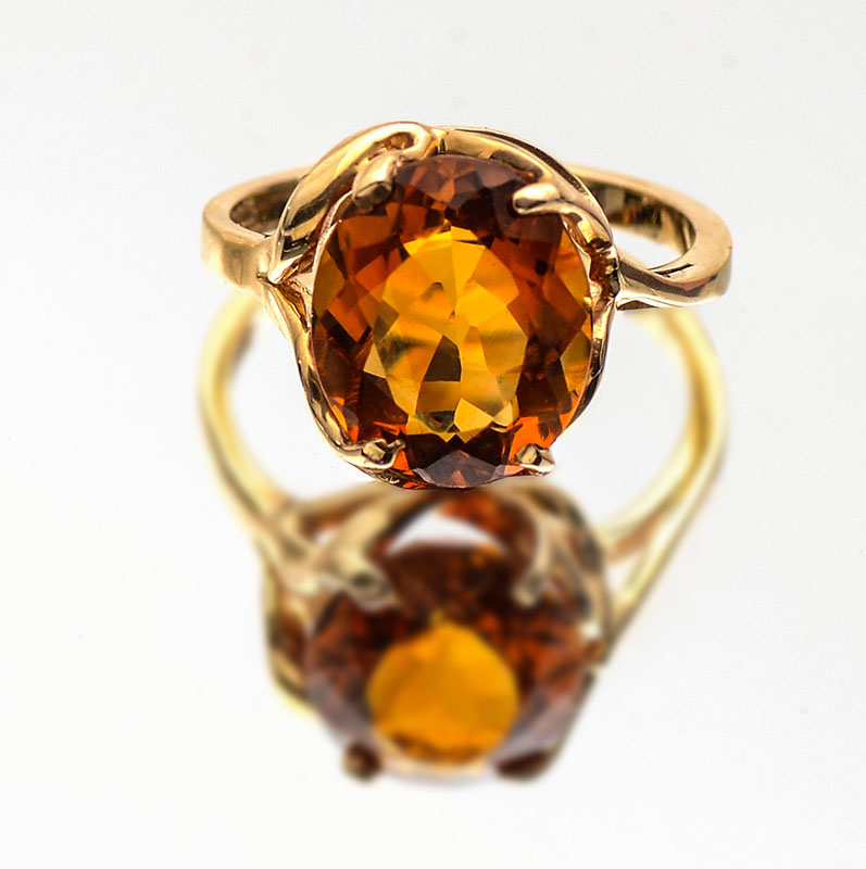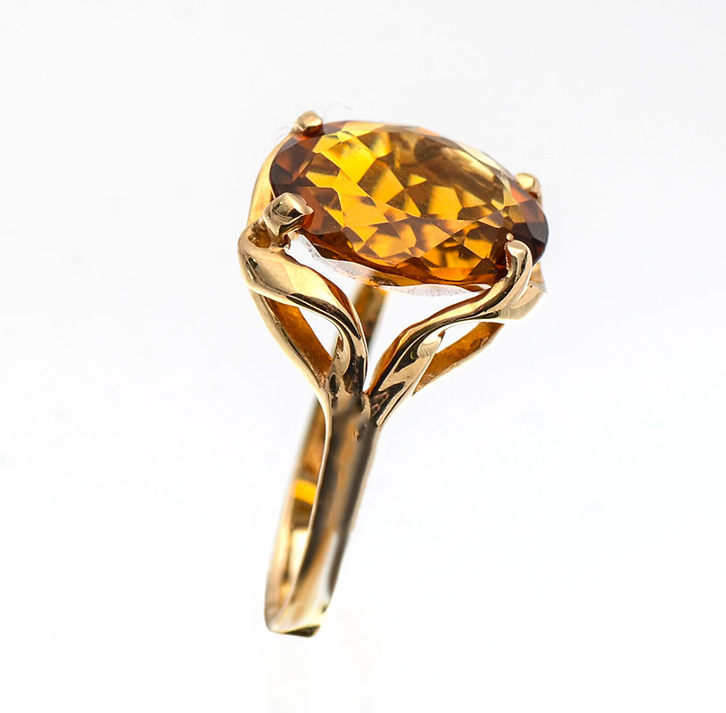 14K VIVID OVAL 3.86CT CITRINE DESIGNER RING: Well made designer ring in yellow gold marked 14K with the maker's mark. Size 6.25. 3.4 Grams.