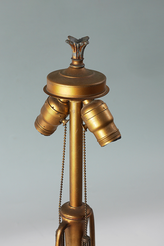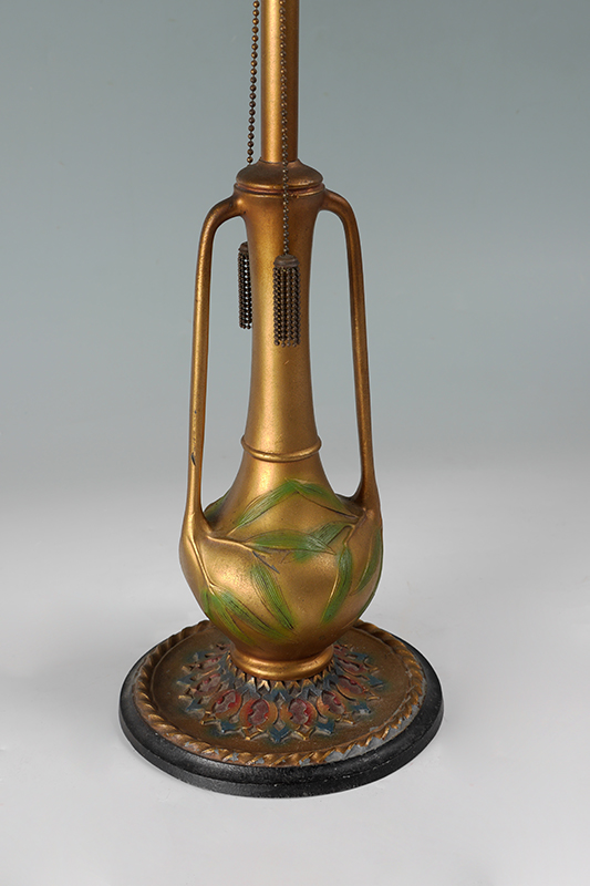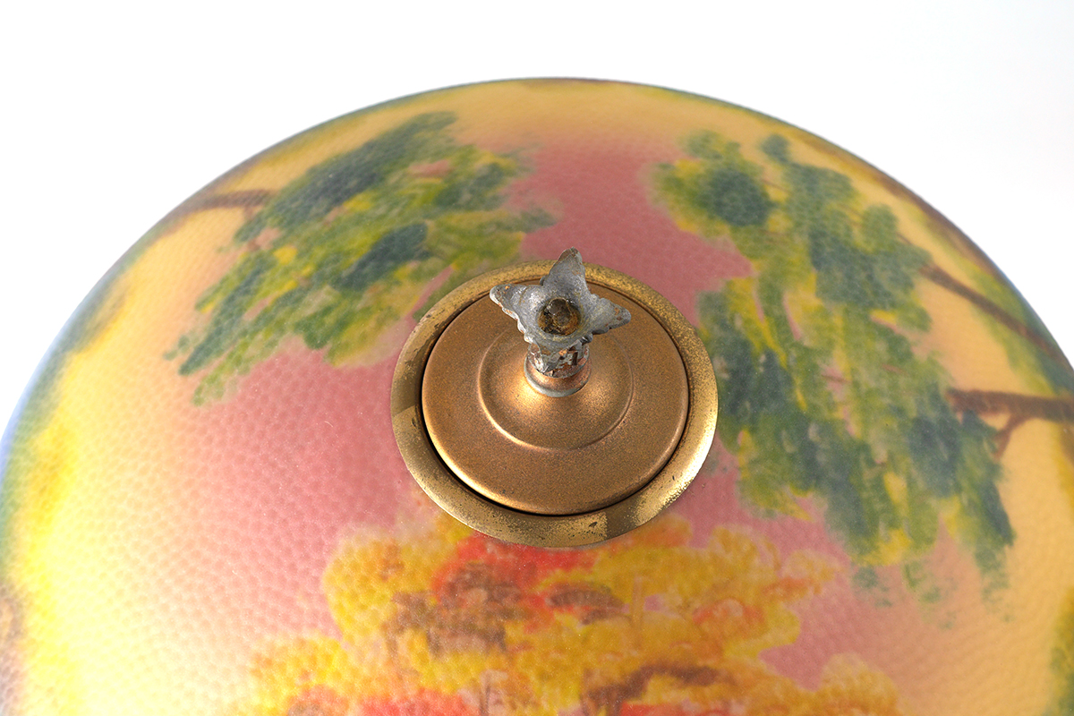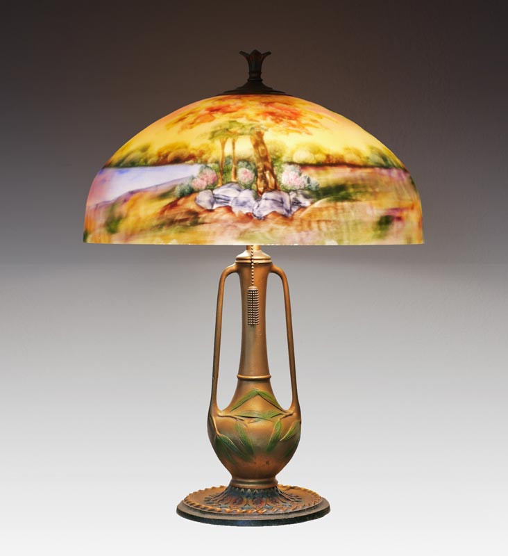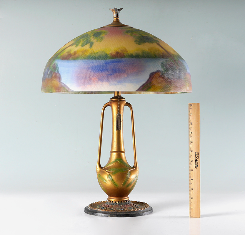 REVERSE PAINTED SHADE PARLOR LAMP: Patinated and painted cast metal double handle form vase base, double socket fixture, 22 1/2'' h. x 7 1/2'' dia. Reverse painted textured shade with river landscape scene, no visible signature, 7 3/4'' h. x 16 3/4 dia.