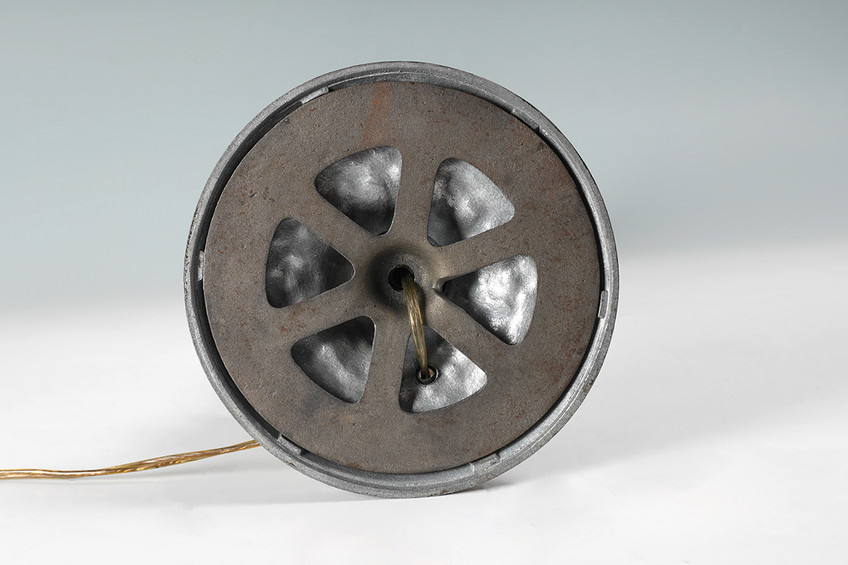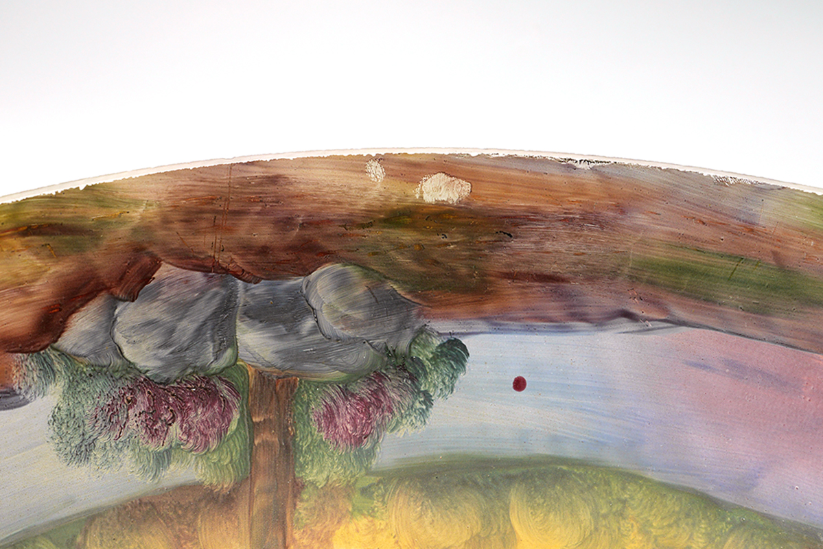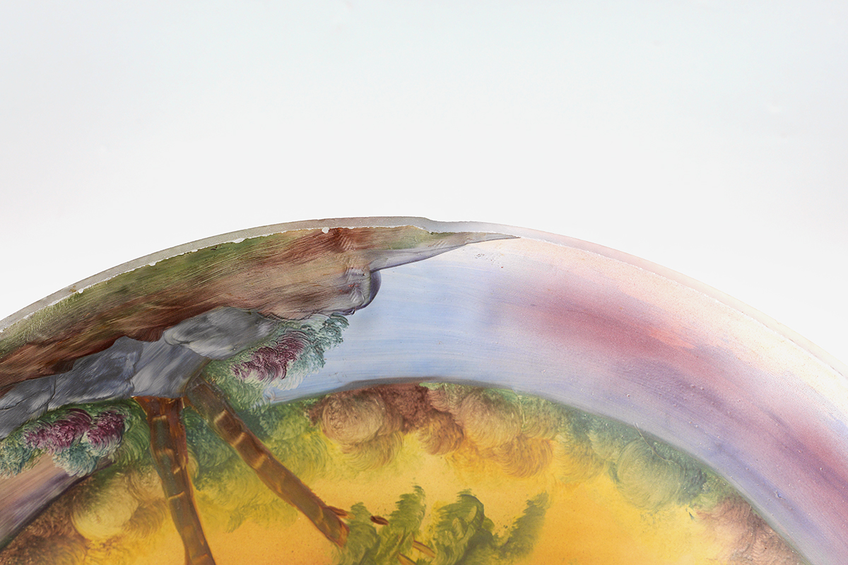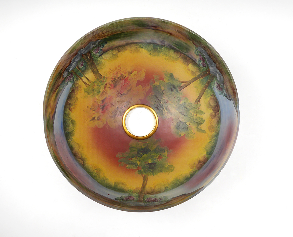 REVERSE PAINTED SHADE PARLOR LAMP: Patinated and painted cast metal double handle form vase base, double socket fixture, 22 1/2'' h. x 7 1/2'' dia. Reverse painted textured shade with river landscape scene, no visible signature, 7 3/4'' h. x 16 3/4 dia.