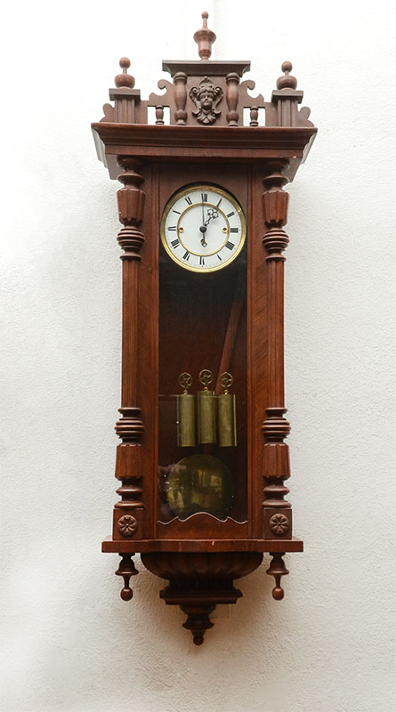 VIENNA TRIPLE WEIGHT REGULATOR CLOCK: Removable architectural pediment with applied masqueron, fluted half column accents, lower turned finial. Unmarked continental time and strike movement, porcelain dial with Roman numerals, overall 48'' h. x 17 1/2'' x 7 1/4''.