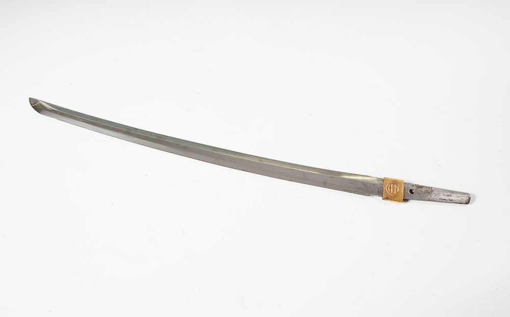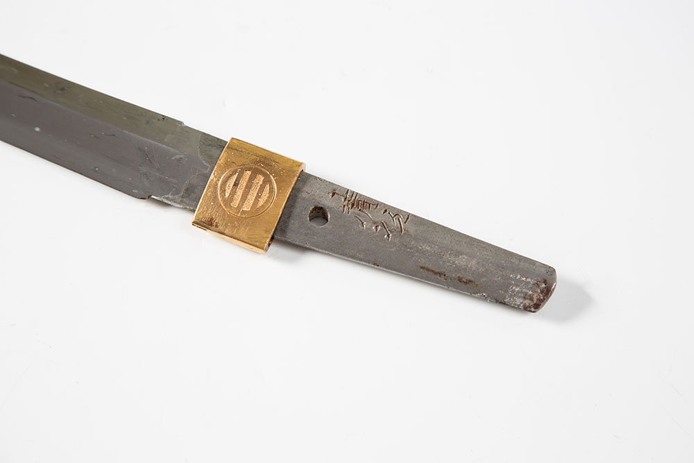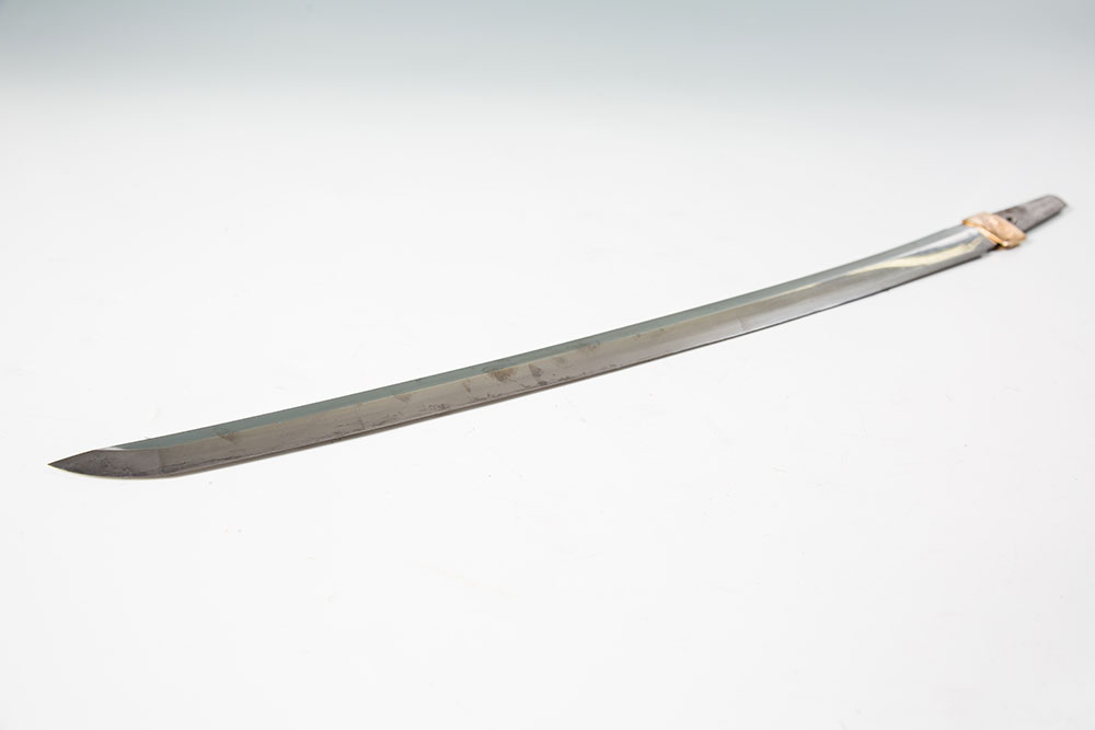 JAPANESE WAKIZASHI SWORD BLADE: Blade only with brass collar, signed on tang, nagasa 46 cm., overall 58 cm.
