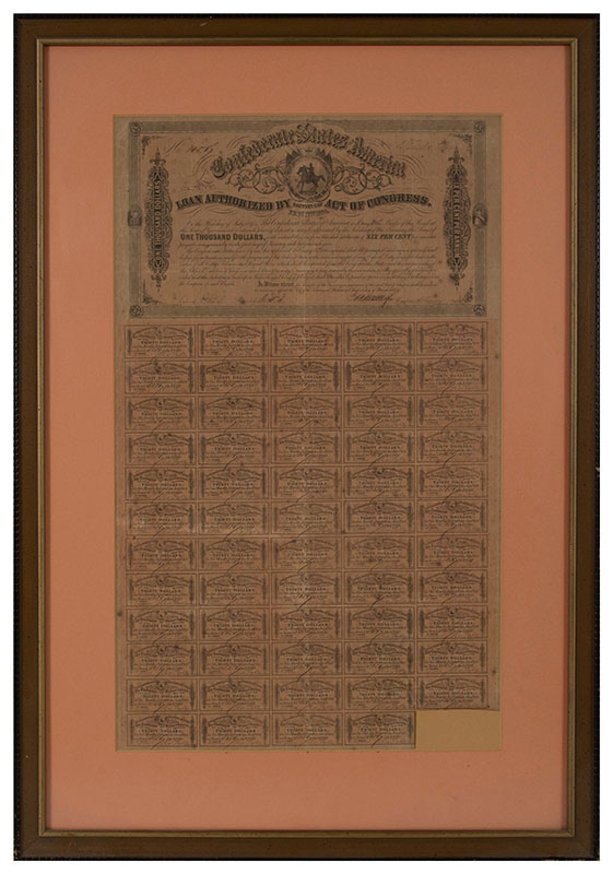 FRAMED $1000 CONFEDERATE LOAN DOCUMENT: 1864 dated, 3rd series, 59 coupons remaining, serial number 10567. Sight size 26'' x 15 1/2'', framed 35'' x 24 1/4''.