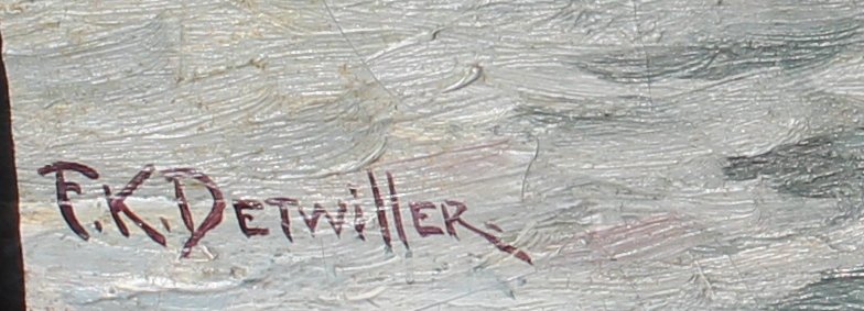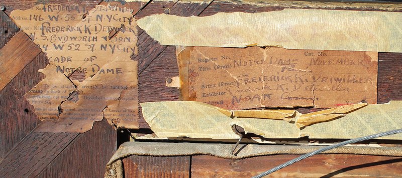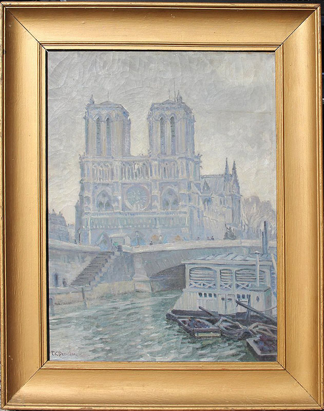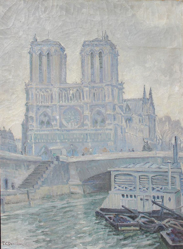 DETWILLER, Frederick, (American, 1882-1953): ''Facade of Notre Dame'', Oil/Canvas, 25.5'' x 19.75, signed lower left, titled ''Notre Dame de Paris, November, 1913'' verso on the canvas, several older exhibition labels affixed, period frame, 33'' x 26.5''.