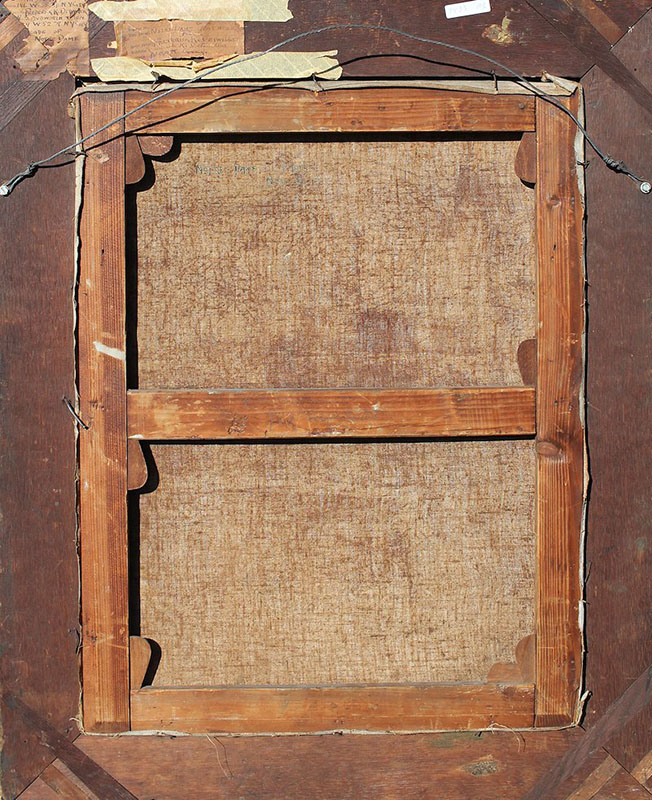 CONDITION: Heavy scattered craquelure, needs cleaning, several minor abrasions, frame has been painted, worn, sold as is.