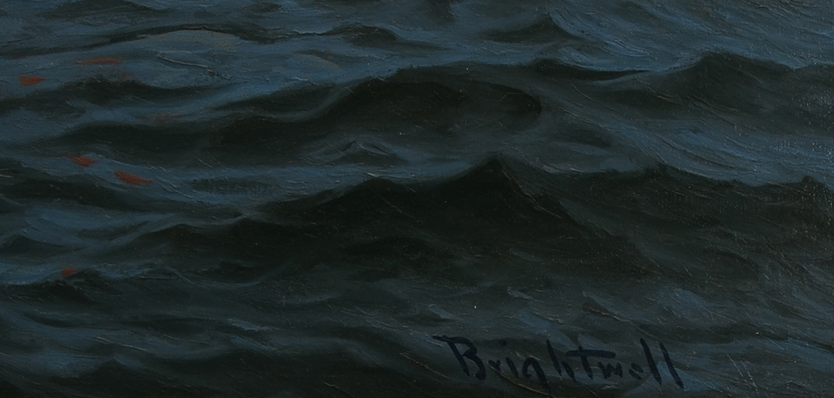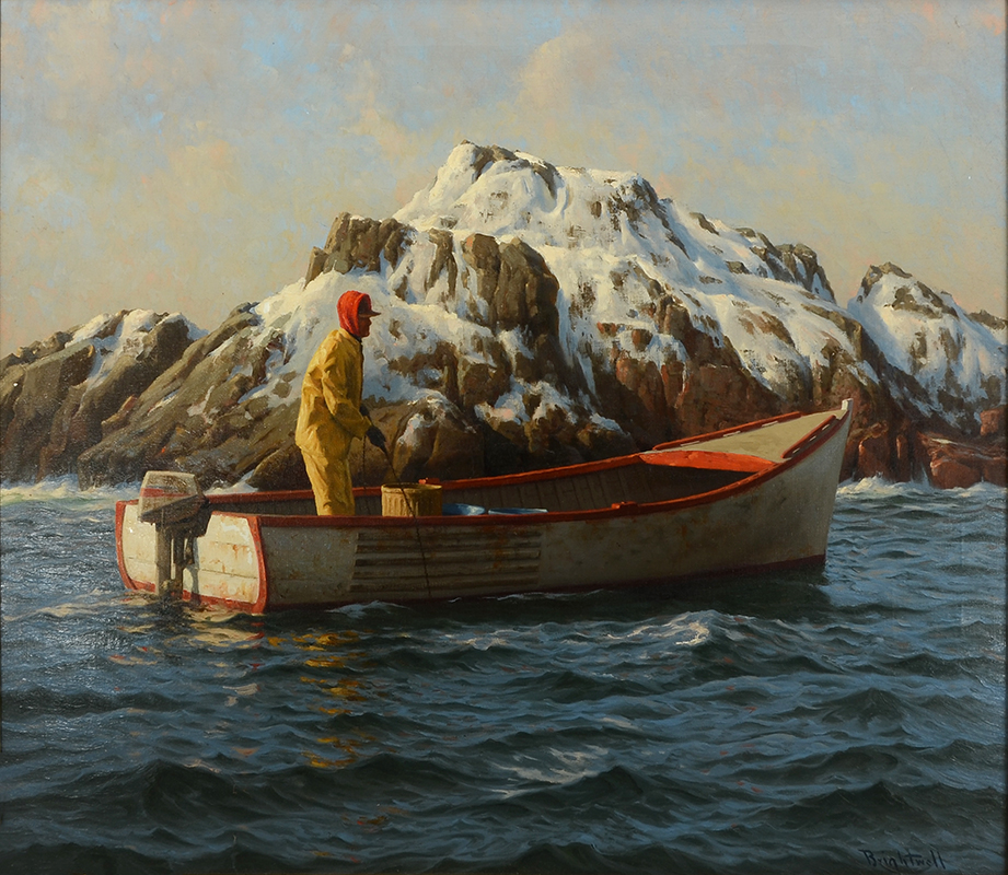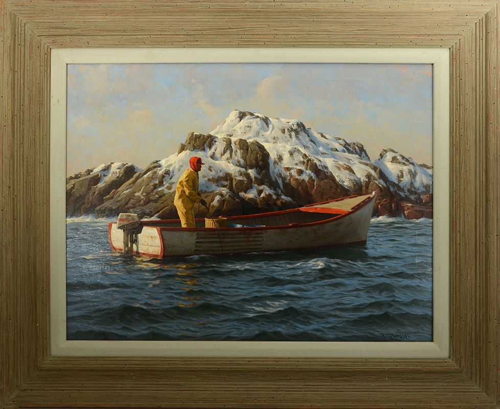 BRIGHTWELL, Walter (American, 1919-2005): New England Lobster Fisherman in winter, Oil/Canvas, 24'' X 32'', signed lower right, original frame, 33.5'' X 41.5''. Walter Brightwell is known for his landscape and marine paintings.