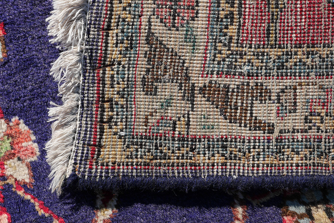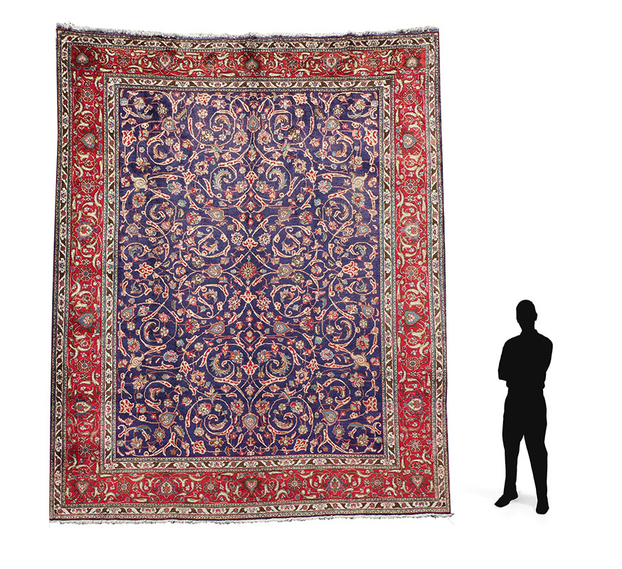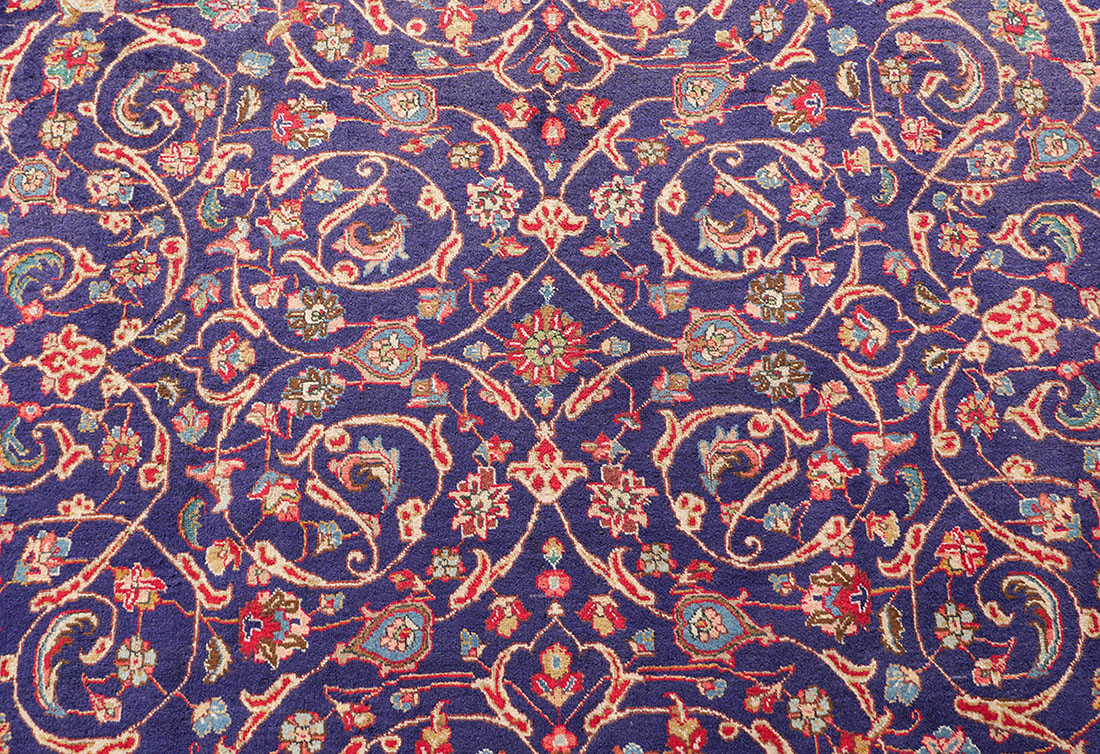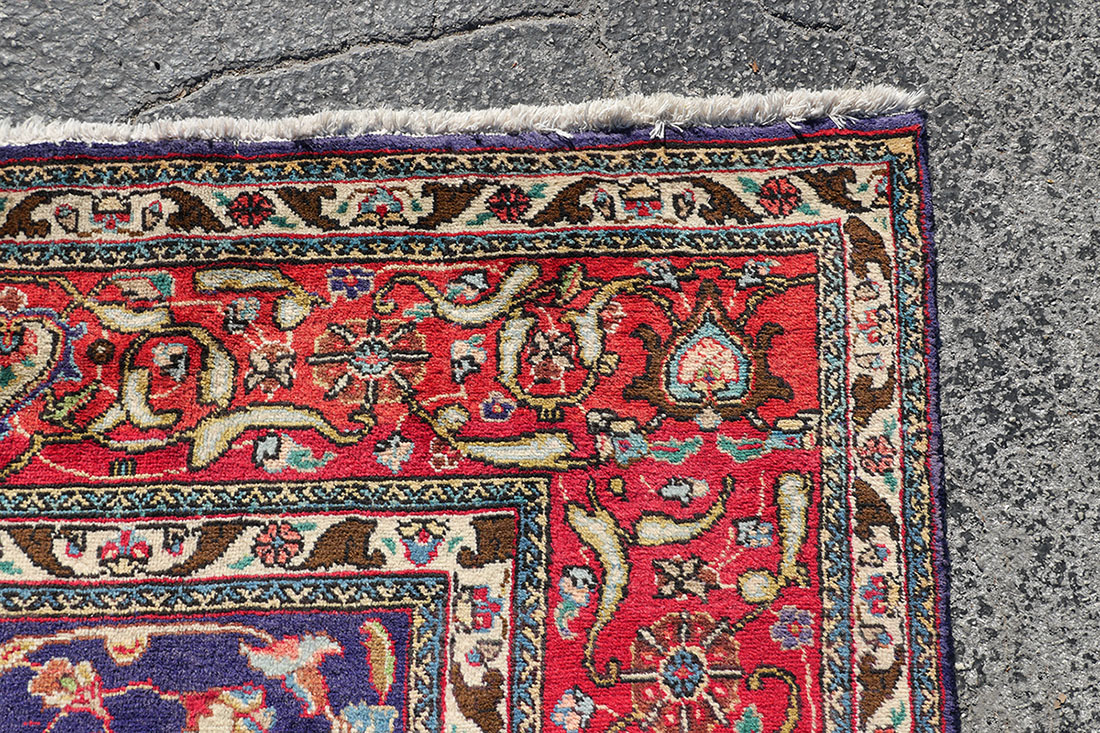 APPROX 30-40 YR OLD PERSIAN TABRIZ HAND KNOTTED WOOL RUG, 10' X 12'8'': This rug has a purply blue field that is covered with an intricate, traditional curvilinear design of scrolling vines that either link or go around the flowers and leaves done in colors of red, white, green, yellow, and brown. The white guard borders and the wide red main border frame the central design.