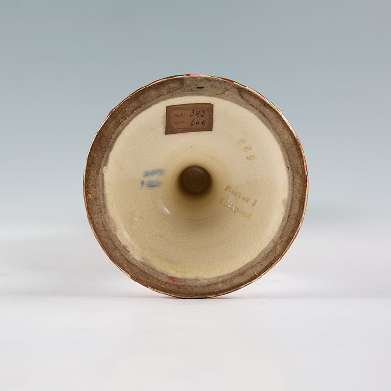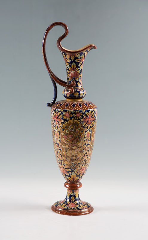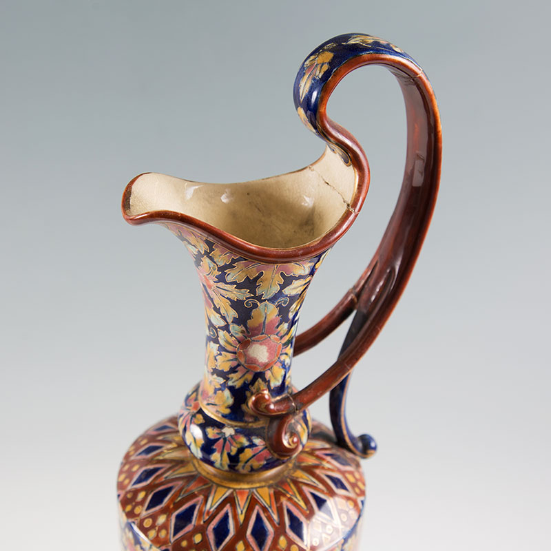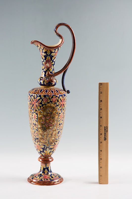 FISCHER BUDAPEST ZSOLNAY EWER VASE: Hand decorated with floral motifs, well marked with impressed Fischer Budapest and number, old label, and blue underglaze mark. Overall measures 19'' h. x 6'' dia.